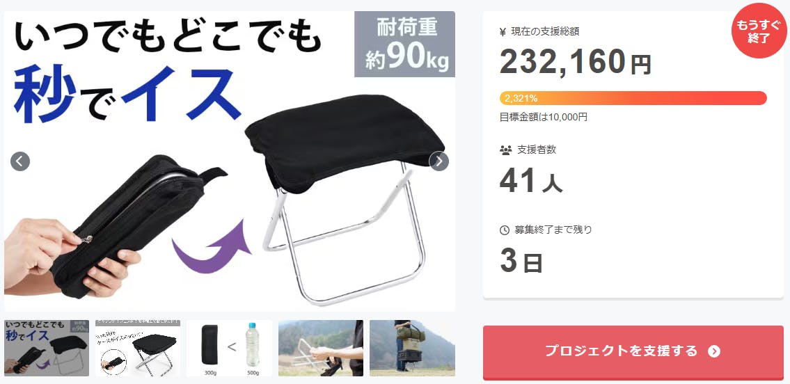 プロジェクト終了後、「バッグ型から3秒で椅子になる!持ち運びもラクラクな超コンパクト折り畳みチェア」をCampfire特別価格で入手することはできなくなりますので、ご支援がまだの方、追加支援をご検討の方はお急ぎくださいますようお願い申し上げます。