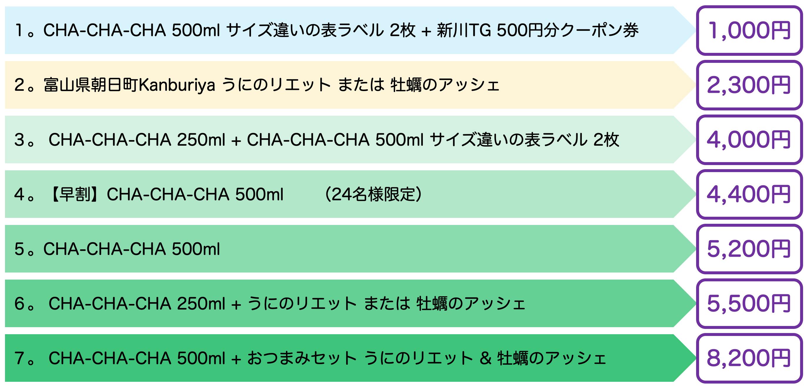 リターン5。は CHA-CHA-CHA 500ml 1本でのご提供です。ぜひ味わってみてくださいませ。