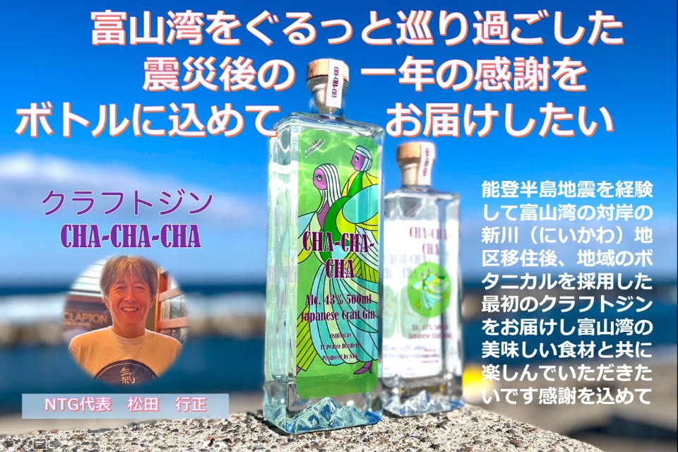 このたび完成したクラフトジン「CHA-CHA-CHA」は、やさしい奥能登の方々と、見ず知らずの移住者を受け入れてくださった富山の方々への深い感謝を込めたものです。