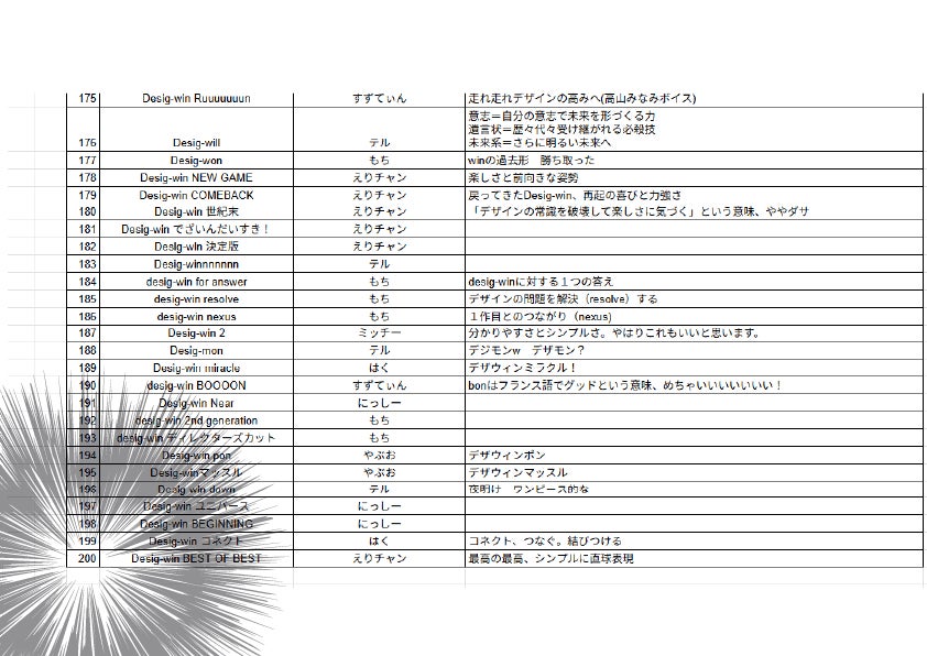 新名称はマエデ内で広く募集され、集まったのはなんと200案!Desig-winっぽさ、デザイナーっぽさ、マエデっぽさ、色んな視点が混じったネーミング案が飛び交いました。