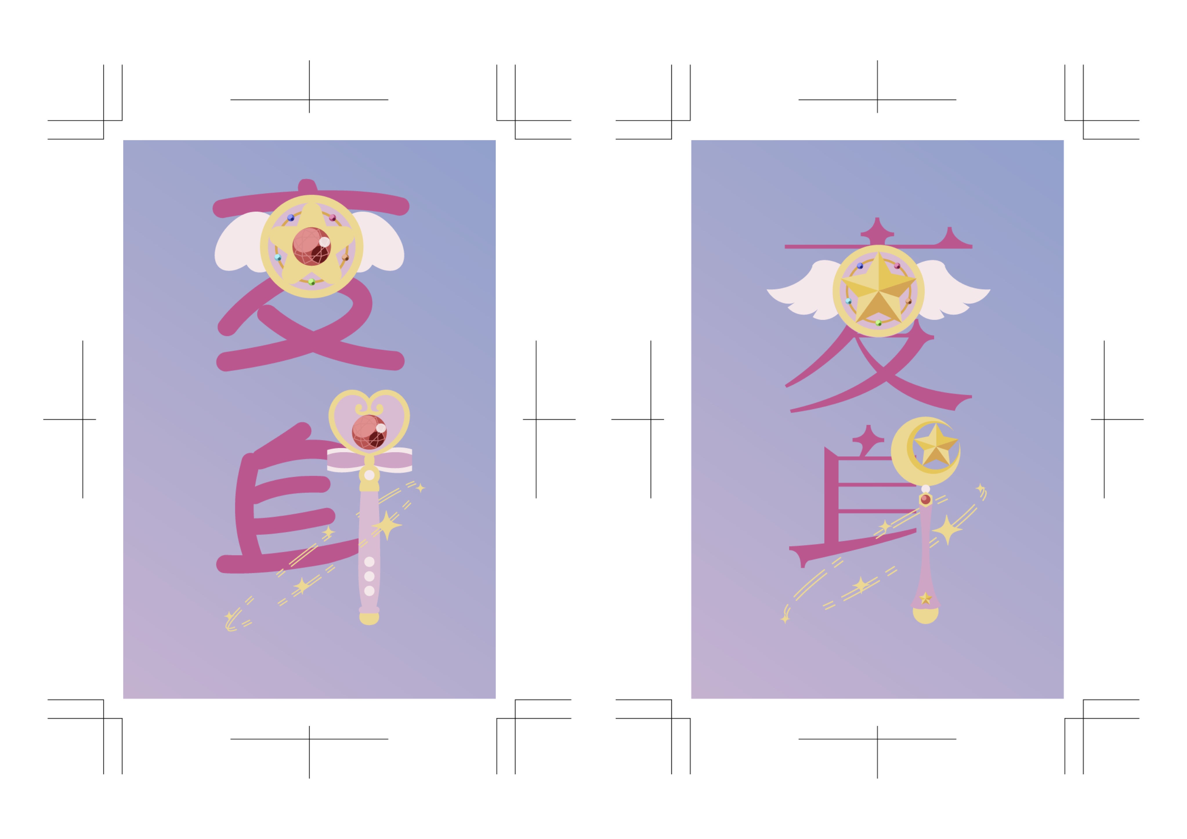 こちらの2つのうち、右側についてなのですが、使用してOKフォントがAdobe縛りっていうのがあるんですけど、その中に、結構キラキラ魔法少女っぽいフォントがあったんで、これこのまま使えるんじゃないかなと思い、そのまま、 ベンっ!て乗せて作りました。