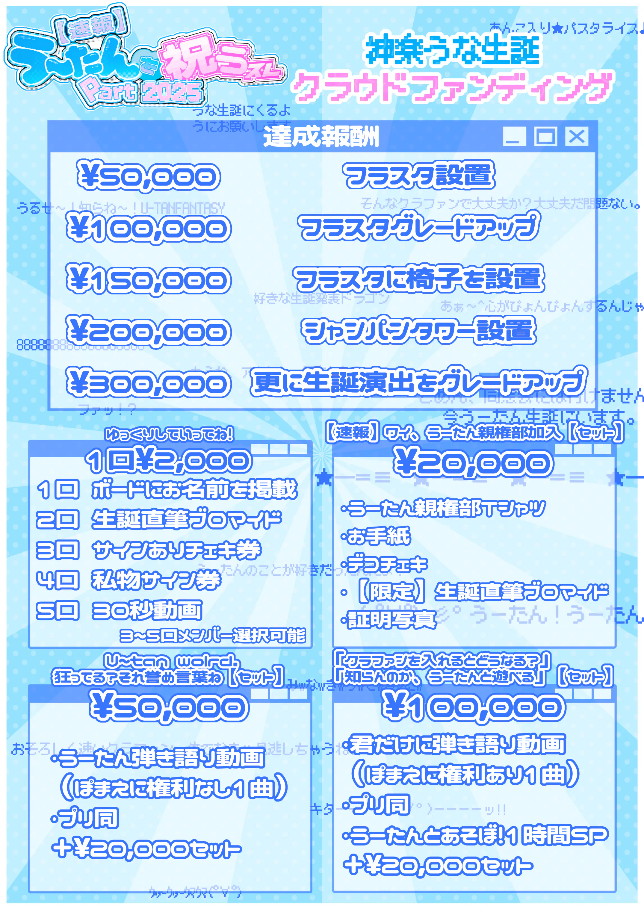 以降 ~ ご支援金額に応じてメンバーの希望に沿いながら、生誕祭の装飾。またリターン品の仕入れ費用や今後のぷれしゃす♡ぱーてぃーの運営費にあてさせていただきます。