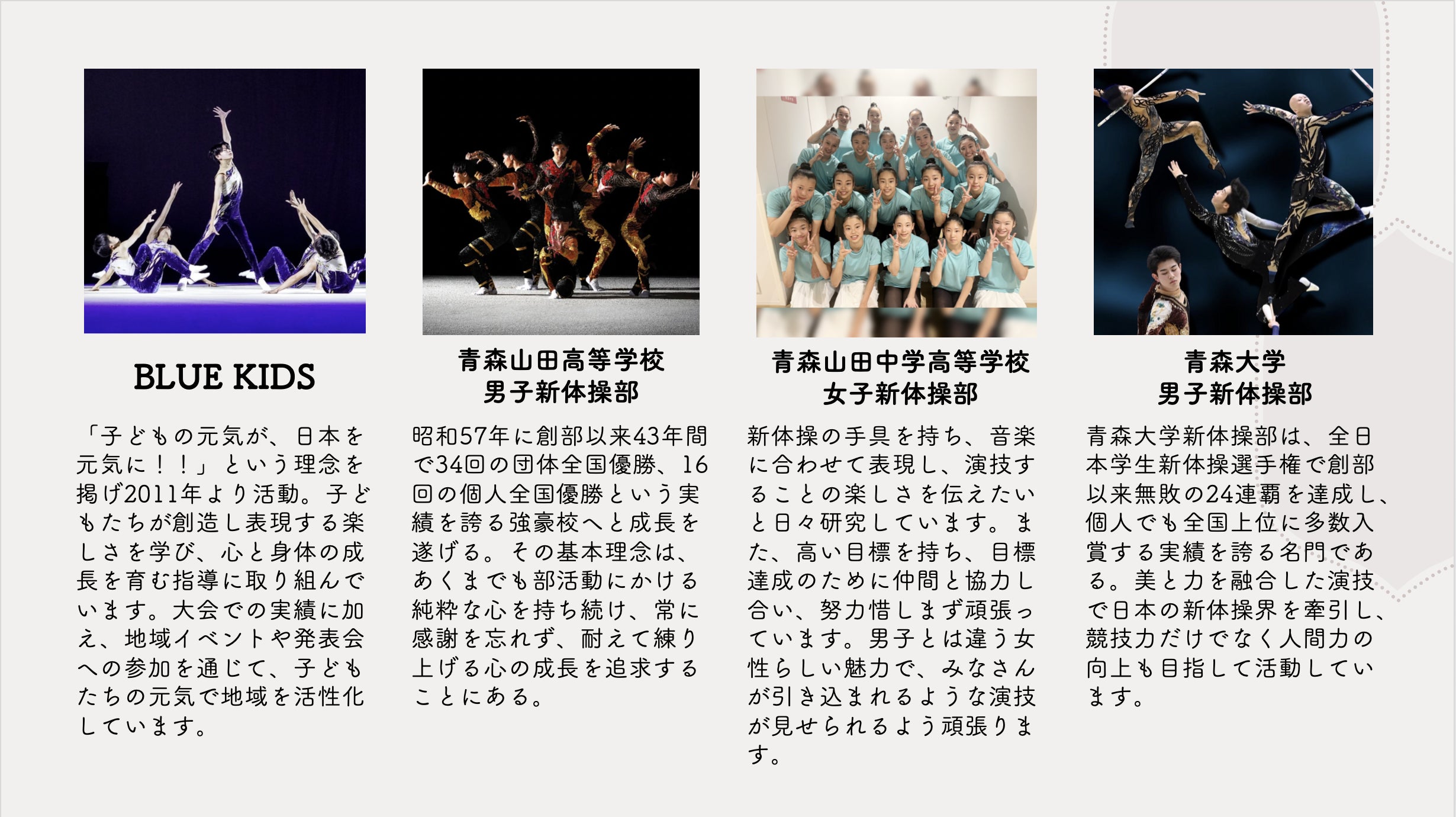 子どもたちが舞台を創り上げる1つの目標に向かって、沢山の方々と協力しながら課題や困難を乗り越える過程が、出演する子どもたちにとって替えの効かない貴重な体験になると確信しています。また、プロダンサーが創造する演目を子どもたち自身が表現するためにリハーサルを重ねながら、日頃から熱心に取り組んでいる男子新体操とは異なる動きや表現を学び、様々な視点や考え方を育む機会になることを期待している。