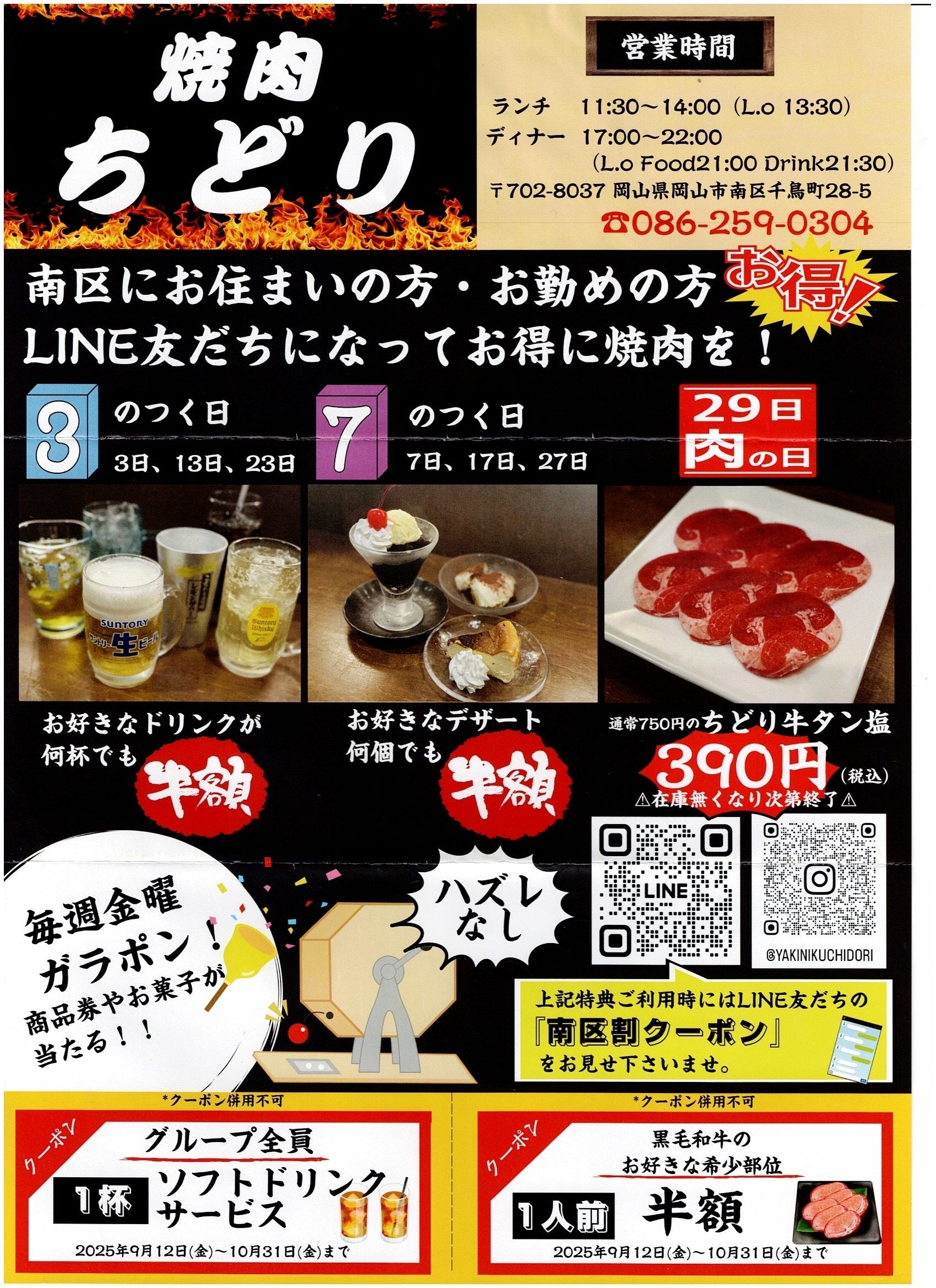 地元の皆様に焼肉ちどりを好きになってもらうためにも、もちろん地元特典をつけた割引なども行っています!