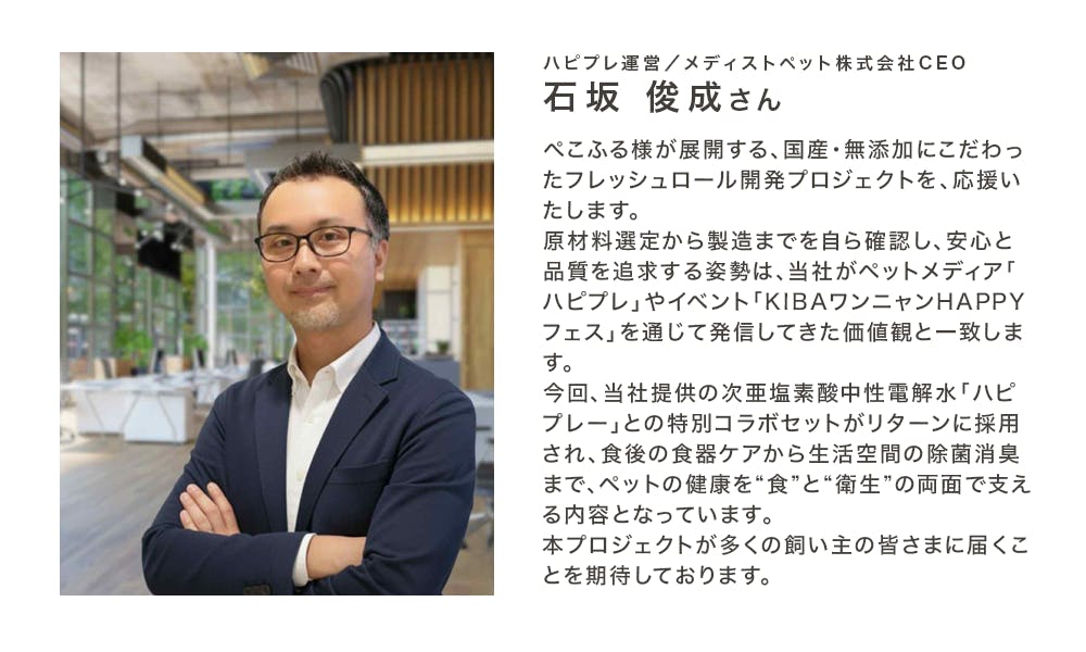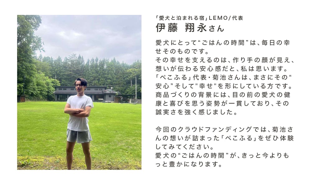 2026/01/28 18:00応援コメント全文紹介の第2弾。あらゆる角度からぺこふるを支えてくださる4名のメッセージをご紹介します!-----------------------------------------------------■4. 兼澤 幸男さん(MOMIJI株式会社 代表取締役社長)『このたびは、クラウドファンディングの挑戦、心より応援申し上げます。私たちは日頃より、地域の野生鳥獣資源を有効に活用し、持続可能な形でジビエ事業に取り組んでおります。その活動のなかで常に感じているのは、「自然の恵みを無駄なく循環させ、人と動物がよりよい関係で共に生きられる社会をつくる」という思いです。今回のドッグフード商品は、まさにその理念と深く通じ合う取り組みだと感じています。野生鳥獣の素材は、高い栄養価や香り、そして自然本来の力を秘めており、本当に良いものを愛犬に届けたいと願う飼い主の皆様にとって大きな価値があります。さらに、課題となっている獣害の軽減、地域資源の活用、循環型社会の実現にも寄与する点で、社会的意義の高い素晴らしいプロジェクトです。同じ自然資源を扱う事業者として、こうした挑戦が地域の未来を明るくし、より多くの人に“国産ジビエの本当の価値”が広がっていくことを心より願っています。プロジェクトの成功と、今後ますますのご発展をお祈りしつつ、微力ながら応援させていただきます。』■5. 阿久津 光昭さん(青葉化成株式会社 泉開発研究所)『こだわりと愛情が詰まったぺこふるさんの製品。品質良いだけでなく見た目もスタイリッシュ、同じ東北の企業として感銘受けるとともに応援しています。オメガ3系脂肪酸の原料として弊社の粉末魚油JENO-3(Japan East North Omega-3)をご採用いただきましたが、これもきっとこだわりぬいた結果と受け止めています。東北大学大学院農学研究科との共同研究から生まれたJENO-3は、まさに家族の健康を願う誰かのために開発したもの。おいしく食べられて健康維持出来たら幸せですね。』■6. 伊藤 翔永さん(「愛犬と泊まれる宿」LEMO 代表)『愛犬にとって“ごはんの時間”は、毎日の幸せそのものです。その幸せを支えるのは、作り手の顔が見え、想いが伝わる安心感だと、私は思います。「ぺこふる」代表・菊池さんは、まさにその“安心”そして"幸せ"を形にしている方です。商品づくりの背景には、目の前の愛犬の健康と喜びを思う姿勢が一貫しており、その誠実さを強く感じました。今回のクラウドファンディングでは、菊池さんの想いが詰まった「ぺこふる」をぜひ体験してみてください。愛犬の“ごはんの時間”が、きっと今よりもっと豊かになります。』■7. 石坂 俊成さん(ハピプレ運営/メディストペット株式会社CEO)『ぺこふる様が展開する、国産・無添加にこだわったフレッシュロール開発プロジェクトを、応援いたします。原材料選定から製造までを自ら確認し、安心と品質を追求する姿勢は、当社がペットメディア「ハピプレ」やイベント「KIBAワンニャンHAPPYフェス」を通じて発信してきた価値観と一致します。今回、当社提供の次亜塩素酸中性電解水「ハピプレー」との特別コラボセットがリターンに採用され、食後の食器ケアから生活空間の除菌消臭まで、ペットの健康を“食”と“衛生”の両面で支える内容となっています。本プロジェクトが多くの飼い主の皆さまに届くことを期待しております。』-----------------------------------------------------原材料から、住環境、衛生管理まで。プロフェッショナルの厳しい目から見ても「これならいける」「共感できる」と言っていただけることが、僕たちの最大の自信になっています。金曜日の第3弾は、共に東北を盛り上げる熱い同志たち、そして実際に商品を愛用してくださった声をご紹介します。応援よろしくお願い致します!株式会社ぺこふる代表取締役 菊地 諒purpose:はらぺこたちのおなかもこころもフルにするmission:食べる想い出をつくる もっと見る