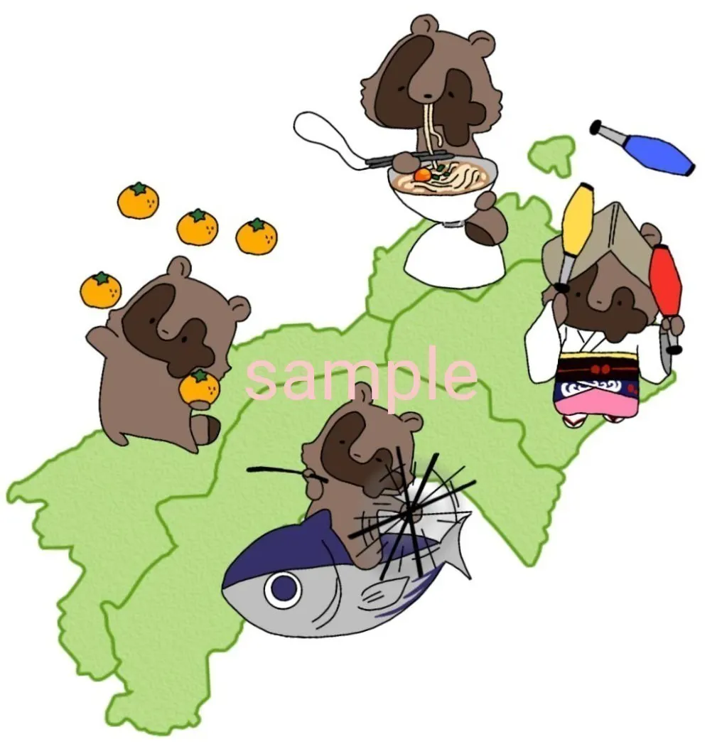 四国をモチーフにしたオリジナルキャラクター「タヌシ」を作成し、缶バッジやTシャツ、今治タオルなどをご用意しています。