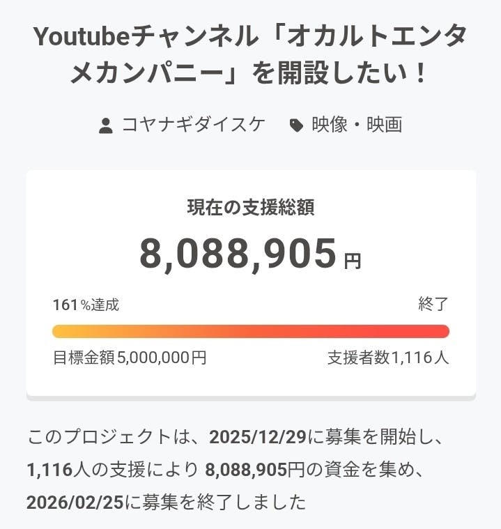 2026/02/26 11:43約2ヶ月の間やってきたクラウドファンディングが、昨晩無事に終了しました。なんと、目標額の161%達成。800万を超える金額が集まりました。皆様、本当に本当にありがとうございます!昨年の夏にオカルトエンタメ大学が終了し「これで俺もオカルト仕事からは卒業だなぁ」と思っていました。それでもやはり辞めたくなくて、未練がましく続けて、結果的にこの景色を見られたことが何より嬉しいです。改めて支援してくださった皆さまに深く御礼申し上げます。本当にありがとうございました。次はオカルトエンタメカンパニーの入社式でお会いしましょう。オカルト最高!▼オカルトエンタメカンパニー面接動画はこちら もっと見る