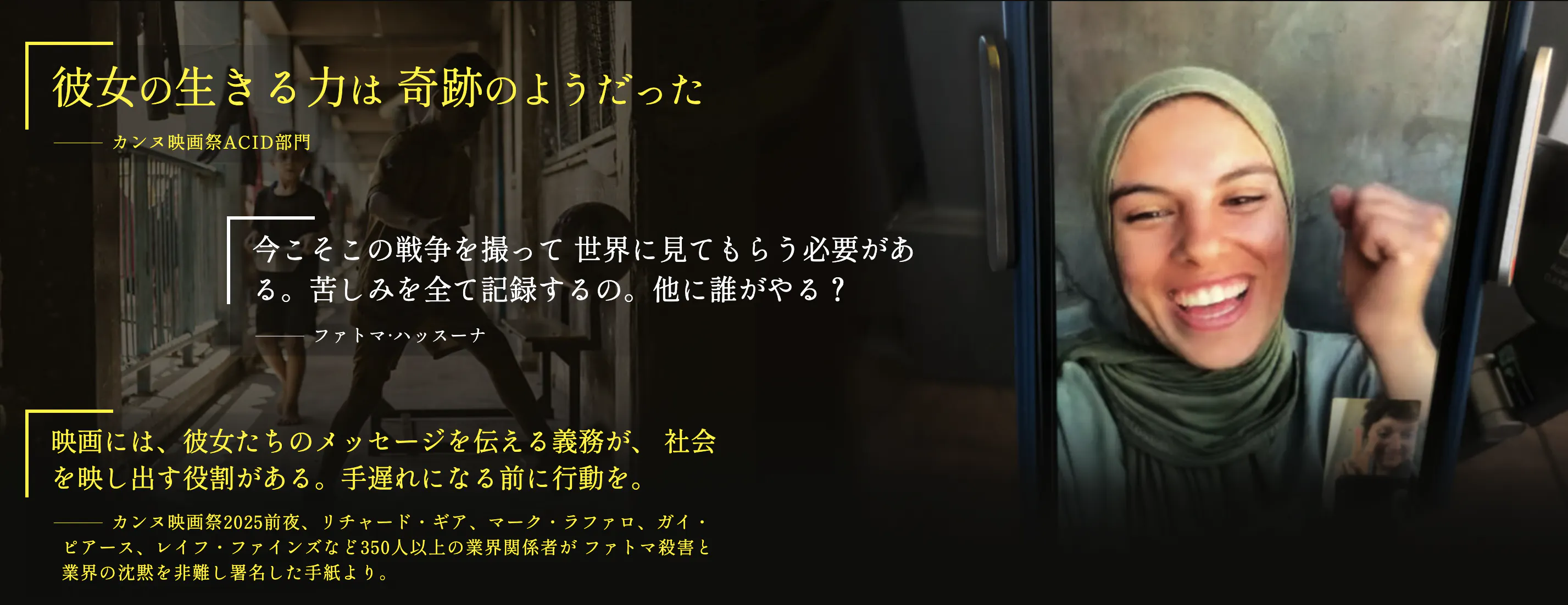 ファトマ・ハッスーナへの追憶 私たち映画製作者は、毎年開催するカンヌ映画祭のプログラム選定の過程でセピデ・ファルシ監督の映画『⼿に魂を込め、歩いてみれば』(原題:Put Your Soul on Your Hand and Walk)の主⼈公ファトマ・ハッスーナと出会いました。彼⼥の笑顔、証⾔、ガザを撮影した写真や動画は、爆撃や悲しみ、飢えの中で⾷料品を配る粘り強さと同じように、まるで奇跡のようでした。彼⼥の物語は私たちに届き、スクリーンに現れる度に、彼⼥が⽣きていることを知り、彼⼥の⾝を案じました。 2025 年 4 ⽉ 16 ⽇、カンヌ国際映画祭ACID部⾨で映画の選出を発表した翌⽇、イスラエルのミサイルが彼⼥の⾃宅を標的とし、ファトマと彼⼥の家族数名が死亡したとの報せに、私たちは衝撃を受けました。ガザで標的とされたジャーナリストとフォトジャーナリストのリストにまた1つの名前が加わりました。現時点でも、爆撃、飢え、ジェノサイドによって命を落とす被害者のリストが増えており、イスラエル政府が責任を負うべき状況が続いています。 映画製作者として、映画の普及に取り組んでいる私たちにとって、ファトマが指摘したように⼀⼈ひとりの顔や体、居た場所など存在を⽰すものを意図的に抹消する⾏為の重さを無視することはできません。映像を制作し、上映することは、これらの映像と現実が存在することを主張することです。イスラエル国家がパレスチナの現実を繰り返し抹消しようとする中、私たちはセピデ・ファルシ監督の映画を上映し続けることで、ファトマと彼⼥の⽣きた現実が存在し、今も存在し続けていることを主張します。 私たちは、奇跡的な⽣命⼒を持つこの若い⼥性の映画を観て選びました。彼⼥が私たちと共にいない今、私たちはカンヌを⽪切りに、あらゆる映画館にこの映画を届け、⽀援し、上映します。ファトマ・ハッスーナは抵抗、平和、⾃由を体現していました。私たちはこれらのことが破壊されることを拒みます。私たち全員、すなわち映画製作者と観客は、彼⼥の光に値する存在であるべきです。