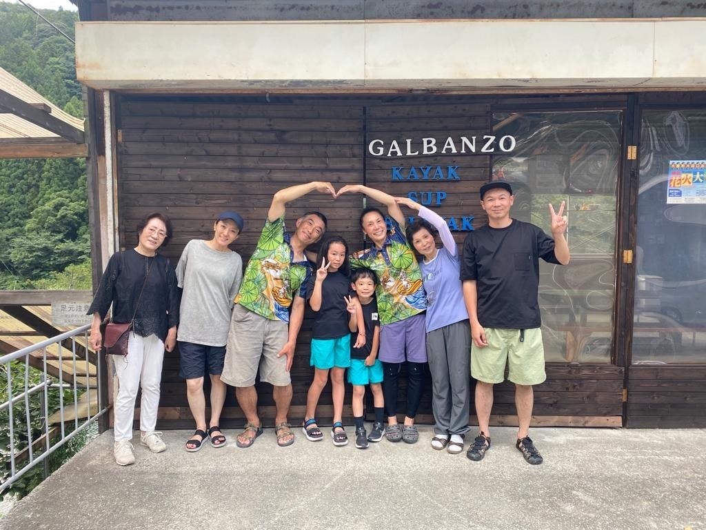 この写真は私の家族がラフティングツアーに遊びに来てくれたときのものです。写っているのは、母・兄夫婦とその子供たち・兄のお嫁さんのお母さまです。右から3番目が私、左から3番目が旦那さん(宣広)です。