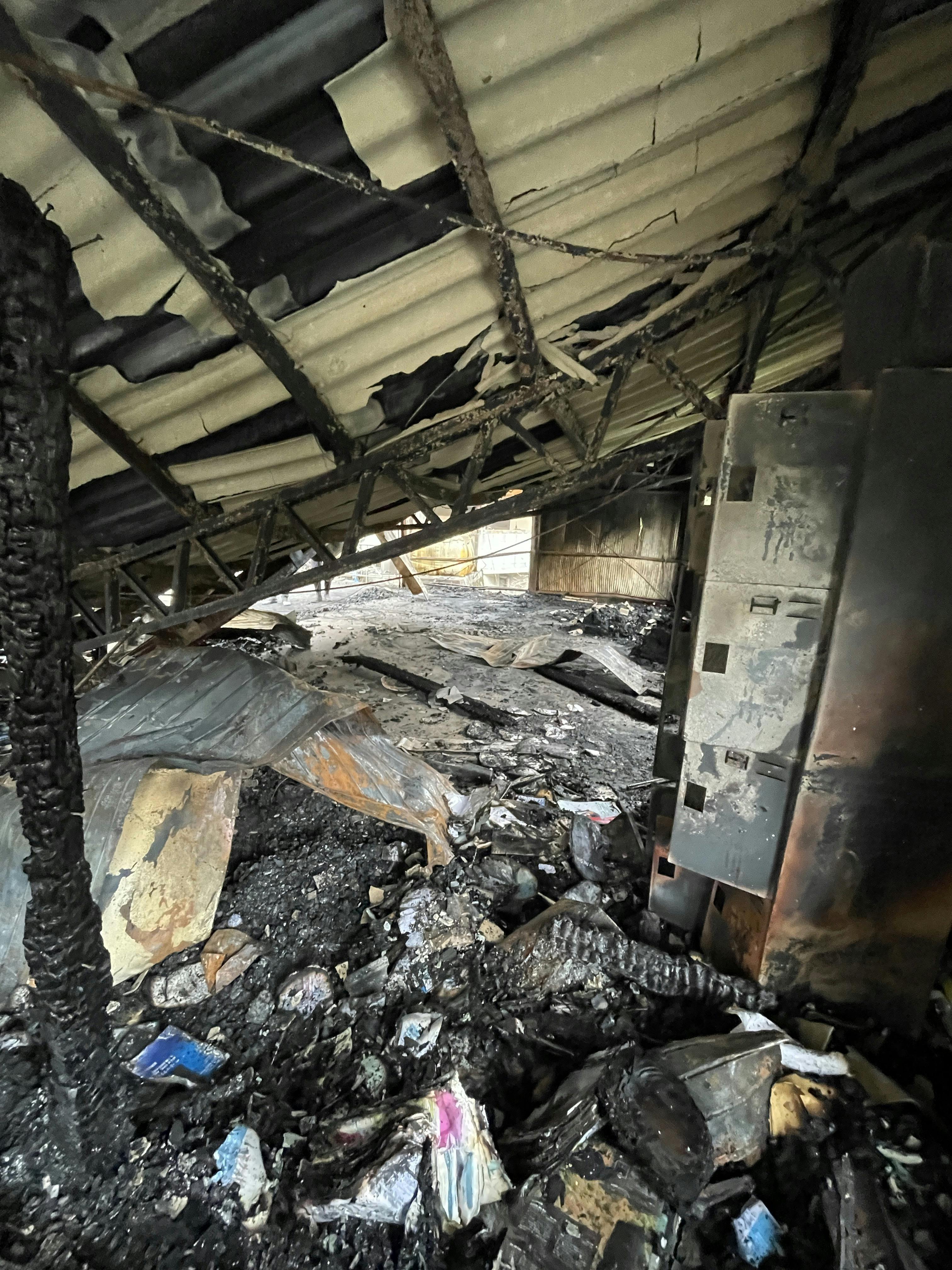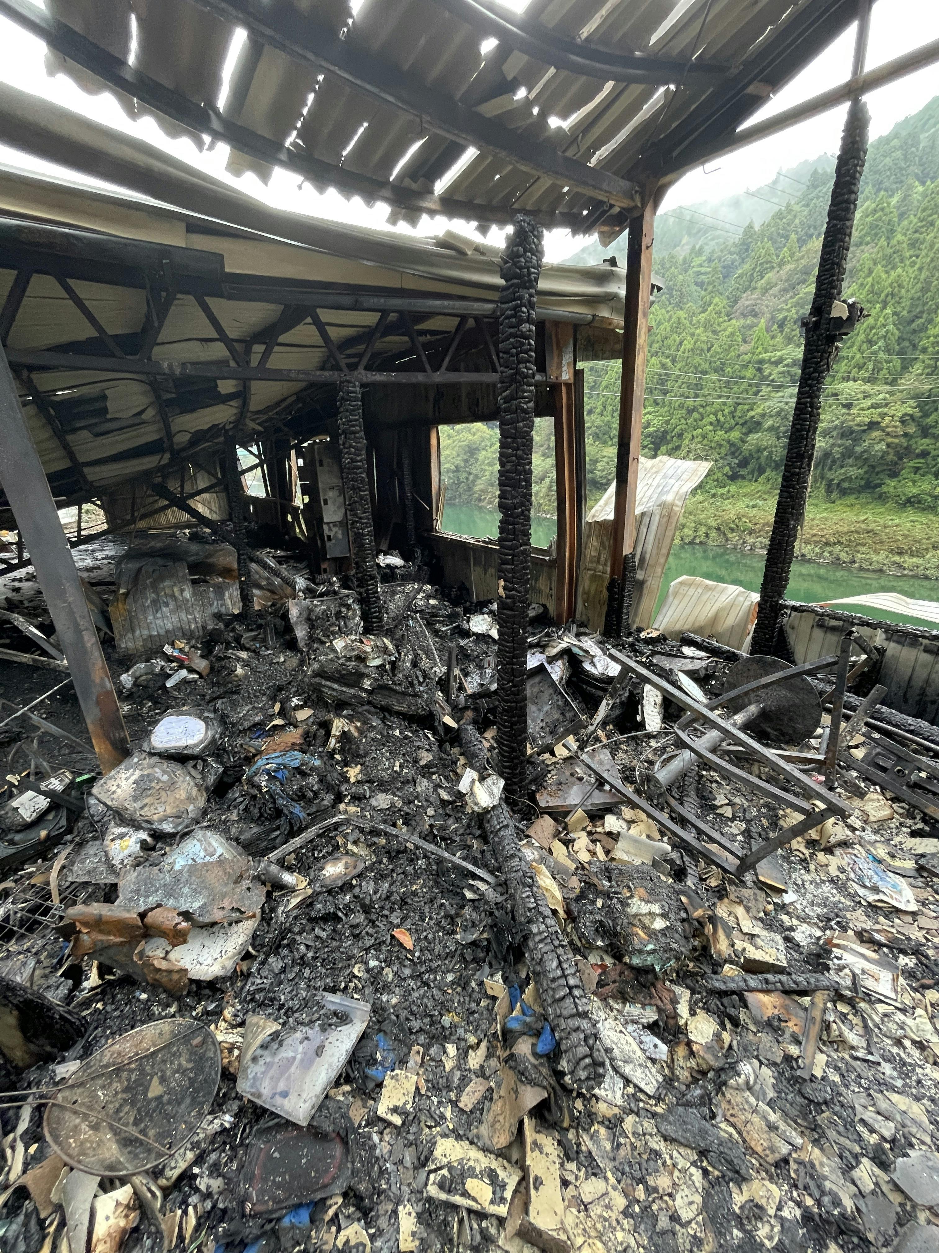 店舗兼ボート置き場だった場所は屋根が崩れ落ち、中にあったものはロッカーを除いて形をとどめていませんでした。6本のラフティングボート、いくつものカヤックやSUP、パックラフトも、信じられないほど跡形なく焼け落ちていました。