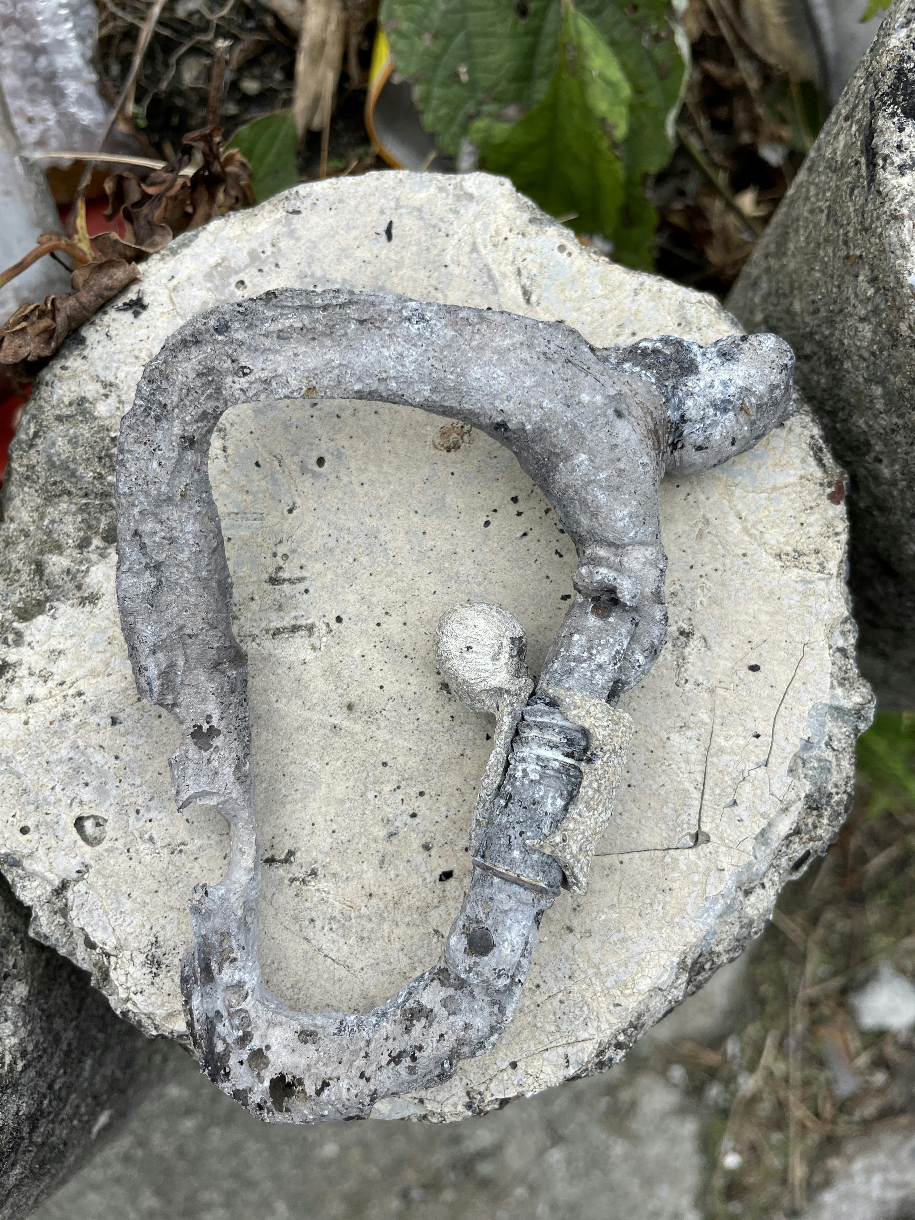 ボート置き場に置いてあった旦那さんのライフジャケットのポケットに入れておいたはずのカラビナは爆発によって吹き飛んだようで吉野川に下りる通路で拾いました。