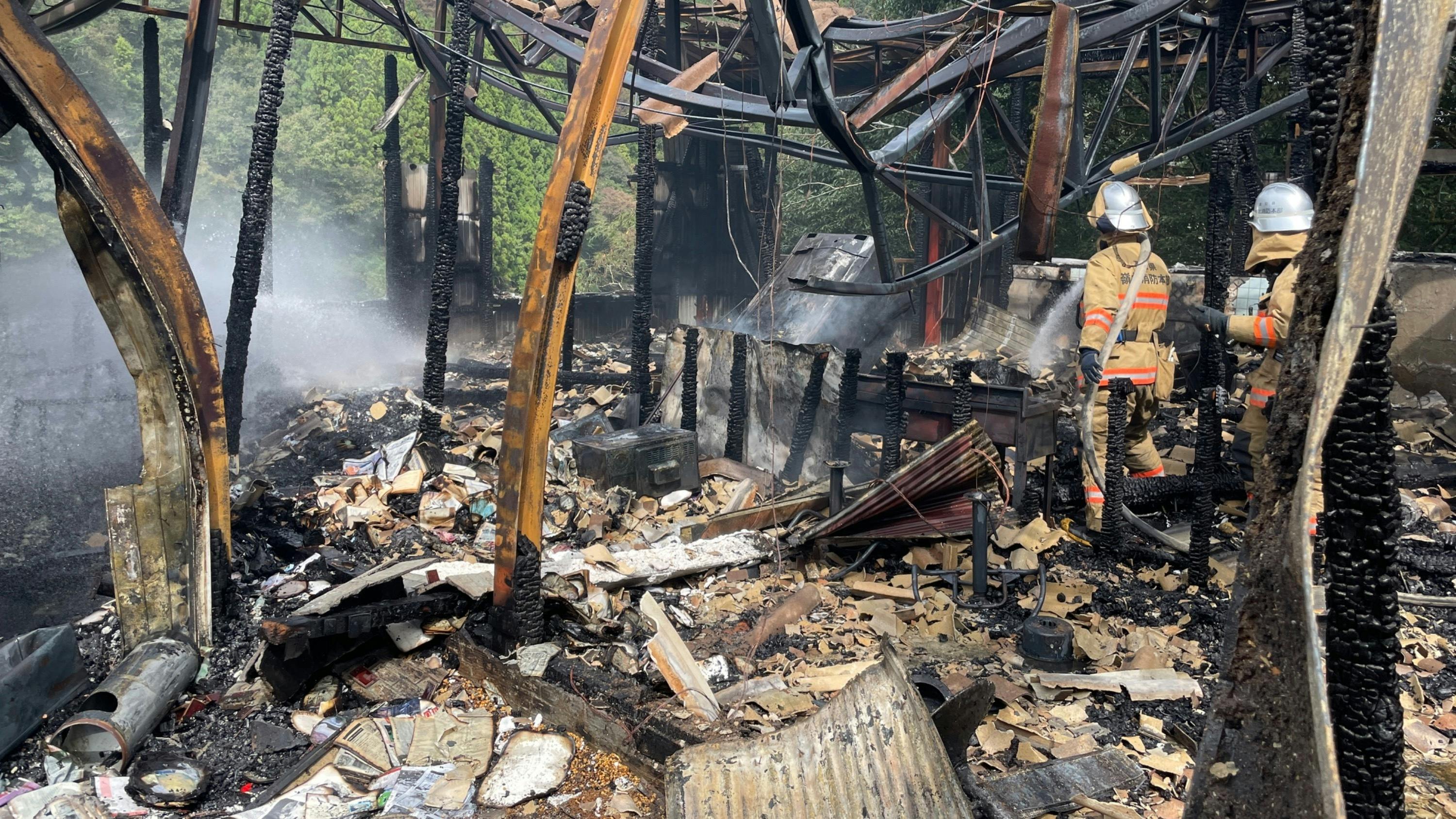 火災当時はかなりの高温だったようで鉄骨は歪み、たくさんの爆発で屋根の多くは吹き飛びました。