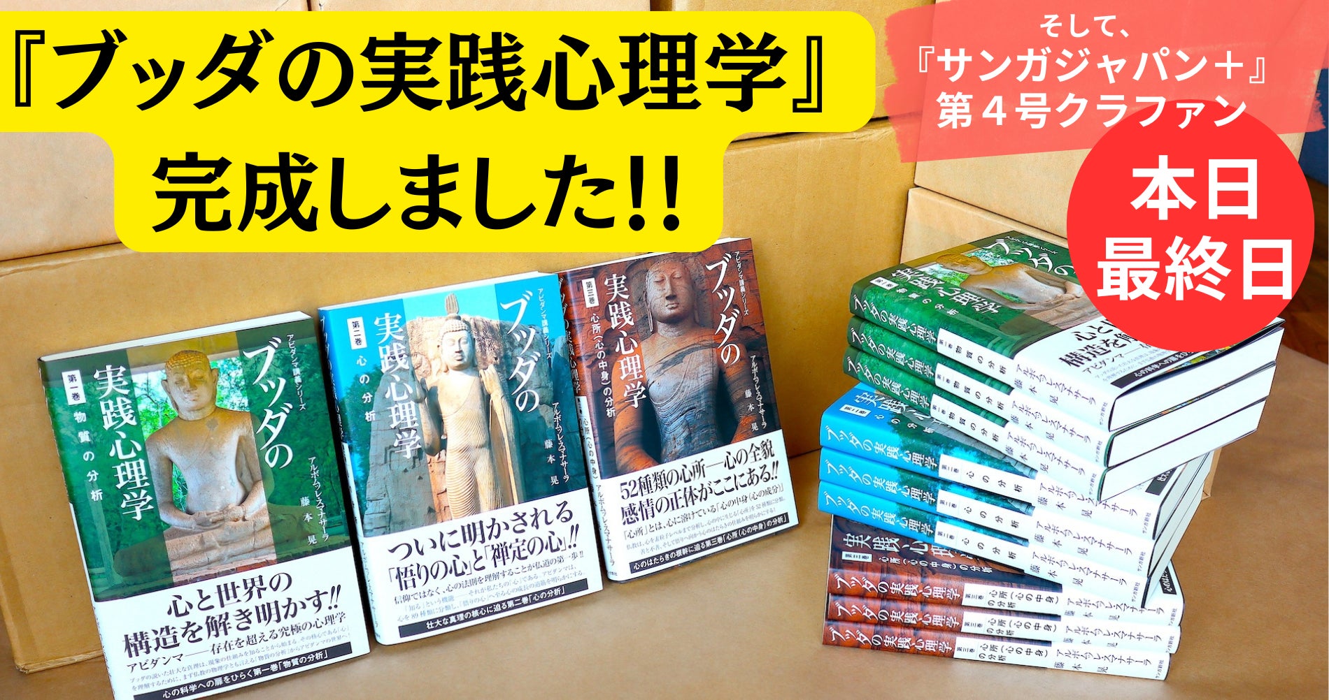 2026/03/29 10:48皆さんのお力で刊行できた『ブッダの実践心理学』このたびは、アルボムッレ・スマナサーラ長老『ブッダの実践心理学』第一巻〜第三巻のクラウドファンディングにご支援を賜り、誠にありがとうございました。皆さんのあたたかな応援のおかげで、このたび『ブッダの実践心理学 第一巻』『第二巻』『第三巻』を無事に完成させ、書籍リターンをお申し込みくださった方々へ発送することができました。サンガ時代に刊行され、多くの読者に読み継がれてきたこの大切なシリーズを、こうしてあらためて紙の書籍として世に送り出せたことを、心からありがたく感じております。スマナサーラ長老の深い智慧、藤本晃先生の丁寧なお仕事、そして何より、皆さまお一人おひとりのご支援が重なって、今回の刊行が実現しました。この本を、これから先の読者へも届けていけることを、たいへん嬉しく思っております。あらためまして、このたびのご支援に深く御礼申し上げます。2026年3月27日。印刷所からサンガ新社に届いた『ブッダの実践心理学 第一巻』『第二巻』『第三巻』。ここから皆さんのお手元に旅立ちました。書籍のお届けについて今回のリターン書籍『ブッダの実践心理学 第一巻』『第二巻』『第三巻』は、2通のクリックポストに分けてお届けしております。また、1〜2日の時間差で2通目が到着する場合もございます。万一、数日経っても1通しか届いていない場合は、お手数をおかけいたしますが、サンガ新社までご一報いただけますと幸いです。『サンガジャパンプラス』第4号クラウドファンディング、本日最終日です現在、サンガ新社では『サンガジャパンプラス』第4号のクラウドファンディングを実施しており、本日3月29日(日)23:59が最終日となっています。今回お届けした第一巻の封筒の中には、このクラウドファンディングのチラシも同封いたしました。チラシ画像も以下に掲載いたします。『サンガジャパンプラス』第4号では、スマナサーラ長老の記事も充実しています。◆アルボムッレ・スマナサーラ × 島田啓介「瞑想と平和~心から始まるエンゲージド・ブッディズム」◆松本紹圭 × アルボムッレ・スマナサーラ「人間に生まれる奇跡~限られた一生で、心はどこまで開けるのか」◆アルボムッレ・スマナサーラ「アルボムッレ・スマナサーラ長老と『無常の見方』『苦の見方』『無我の見方』を読む」さらに今回のクラウドファンディングでは、アルボムッレ・スマナサーラ長老の小冊子『仏教からみた「お金の本質」』(非売品)も、注目のリターンとしてご用意しています。小冊子は『サンガジャパンVol.34』掲載の講演を一冊にまとめた特別復刻版で、お金は悪なのか、豊かさとは何か、欲望とどう向き合うのかを、仏教の視点から問い直す一冊です。現在、目標金額の90%を超えました。あと一息です!『サンガジャパンプラス』第4号のクラウドファンディングは、3月29日(日)10時30分時点で、135万500円のご支援をいただいています。目標金額150万円の達成まで、「あと15万円」のところまで来ています。クラウドファンディング締切は「3月29日(日)23:59」です『ブッダの実践心理学』の刊行を支えてくださった皆さんに、この最後の瞬間、『サンガジャパンプラス』第4号クラウドファンディングのお願いをさせてください。スマナサーラ長老の大切な教えをはじめ、仏教の智慧を一冊の書籍として、さらに多くの方へ手渡していくために、皆さんのお力が、いま必要です。ここで届く一つひとつのご支援が、次の出版へ、次の読者へとつながっていきます。最後の最後まで、あきらめずに取り組んでいきたいと思います。どうか最後のひと押しをいただきたく、本日23:59まで、どうぞよろしくお願いいたします。<クラウドファンディング>仏教総合誌『サンガジャパン+』第4号を「紙書籍」で刊行します!2026年3月29日(日)まで開催中!↓https://camp-fire.jp/projects/929144/view もっと見る