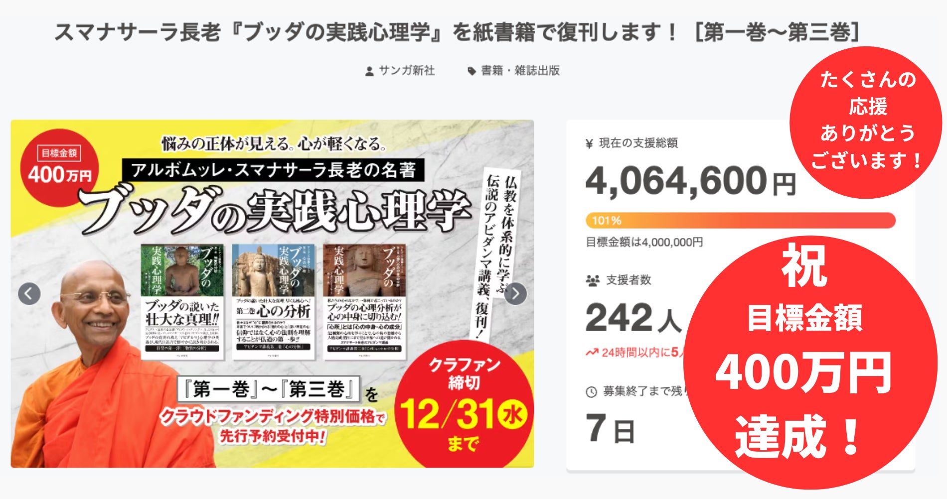 11月22日(土)にスタートしました、「スマナサーラ長老『ブッダの実践心理学』を紙書籍で復刊します![第一巻〜第三巻]」クラウドファンディングは、本日12月24日(水)に、目標金額の400万円に到達することができました!
