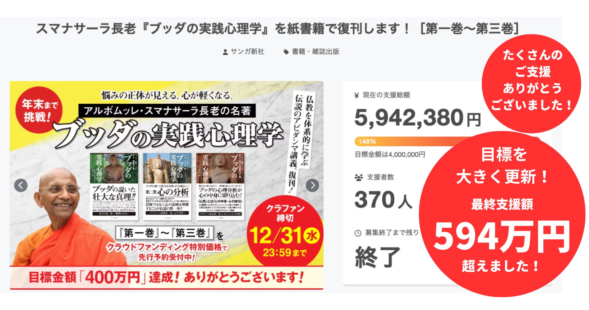 2025年11月22日に募集を開始した「スマナサーラ長老『ブッダの実践心理学』を紙書籍で復刊します![第一巻〜第三巻]」クラウドファンディングは、2025年12月31日をもって、無事に終了いたしました。