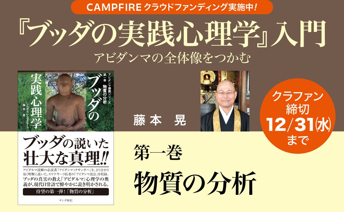 ただいまサンガ新社では、スマナサーラ長老の名著『ブッダの実践心理学』復刊に向けたクラウドファンディングを実施しています(2025年12月31日まで)。そこで今回、『ブッダの実践心理学』の魅力と学ぶ意義をあらためてご紹介するために、シリーズ共著者である藤本晃先生に入門的な解説をお願いしました。『ブッダの実践心理学』第二巻「心の分析」は、「心とは何か」という根源的な問いに、仏教心理学の視点から明確な輪郭を与える一冊です。今回その要点を、共著者・藤本晃先生が解説します。――――――――――――――――――――――第二巻 心の分析藤本晃 (誓教寺住職・『ブッダの実践心理学』共著者)■現代物質科学が扱えない「心」の問題 心って、いったい何でしょうか。これは、現代科学によっても、心理学によってさえも、さっぱり分からないのではないかと思います。科学は物質を調べる学びです。生命の細胞であっても、見えない・計測できない心のはたらきは無視して、物質としてのみ扱います。医療現場の「心を治療する」部門でも、眠れないとか悩み苦しみで体調が崩れたなどという体に現れた症状に対して治療を施すものです。二百年前に始まった心理学も、心霊現象など非物質的なものを扱う部門はじきに切り捨てられ、言葉や体に現れる表現パターンから心理状態を研究する行動科学が主流になりました。 心は見えません。聞こえません。匂いも味もなく、場所を取らないので、どこにあるかも、ないのかも分かりません。心が体という物質に何かをさせたら、それは見て分かります。それら物質を通して表現された現象だけを扱うのが、現代物質科学の限界なのです。心は、どんな機械でも計測できないのですから。 他の生命の心のことは、理解しにくいものですから措いておきましょう。しかし自分の心のことは、逆に機械なんか使わなくても、自分でありありと分からなければなりません。「心は分からない」などと考えているものも、私の心なのです。心は、修行して悟るために唯一、必要不可欠な「道具」ですから、ブッダの教えを学んで悟りを目指す私たちは、心の正体をも、ぜひブッダに教えてもらいましょう。■ブッダは心を「89種類」に分類した お釈迦様とアビダンマ論師たちは、心の正体も知り尽くしています。仏教では、心とは、何かを「認識する」というはたらき、それだけだと定義します。誰の、というか、どの心も、ただ何かを「認識する」というはたらきだけなのです。 心の正体をこのように見抜くだけでも驚きです。しかし仏教ではこれに留まりません。さらに、心を二つの側面から分析します。一つは、心のレベル。もう一つは、スマナサーラ長老の表現では「心という水に溶けている内容物」です。絶え間なく生滅し続ける心は、そのたびに欲が出たり怒っていたり静まっていたり、コロコロと違う心になっています。飲み物で言えばコーヒーだったりオレンジ果汁だったり、いくつもの異なる様相を持っています。 瞬間ごとに心に溶け込むものはアビダンマでは「心所」と呼ばれ、これも詳しく分析されています。本シリーズでは次の第三巻で学びます。 ここ第二巻「心の分析」では、心のいろいろなレベルを、89種類に分類して分析しています。何かを認識するはたらきである心の一瞬ごとのレベルというか状態が、必ず、89種類のどれかだと断定するのです。 お釈迦様の分類をそのまま用いています。まず、地獄から天人までの欲界の心を分析し、その中で特に人間・修行者の心に焦点を当てますが、善心や不善心、そしてそれらの結果・業である異熟心が、何段階かにレベル分けされます。その上には色界禅定の四段階と無色界禅定の四段階があります。禅定の心は、誰が入定しても各段階ごとにまったく同じレベルの心です。そして、悟りの四段階・四沙門果それぞれの果心四つと、悟る直前の道心四つ。これで心のレベルをすべて分類し尽くしました。 しかし、分類して言葉を知るだけではその内容はまだ分かったとはいえません。ここで、スマナサーラ長老の解説が本当に必要になります。「心って何ですか」。「異熟・業って何ですか」。「善・悪って何ですか」。そして禅定や梵天界、さらに悟りの各段階の心まで、言葉だけでは分かったとはいえない内容を、いとも簡単に解説していきます。 アビダンマの学びが難しいと感じられるポイントが、ここです。どんなに精密に分類して分析してあっても、言葉の上ではすっきり理解できそうでも、「その言葉が意味するそれってどういうことですか?」と、中身を知ることは、まったく別の問題なのです。誰かに教えてもらわないとどうにもならないその壁を、スマナサーラ長老が簡単に壊して、一つずつ解説していきます。※「第三巻 心所(心の中身)の分析」に続く(近日公開予定)