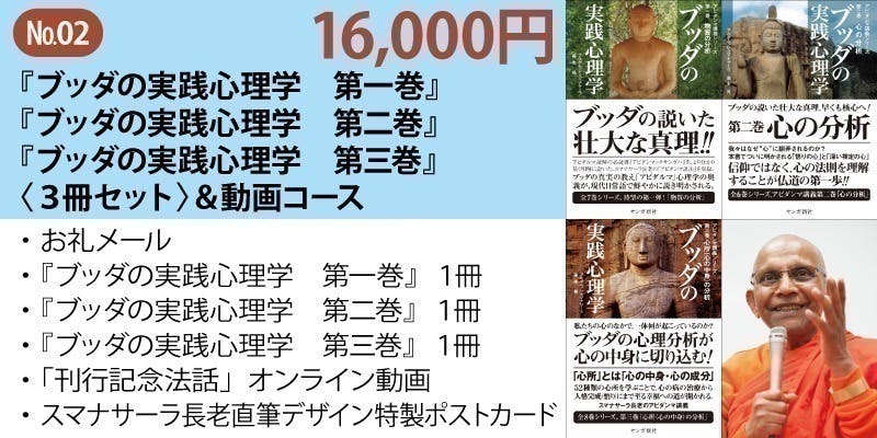 『ブッダの実践心理学 第一巻』、『ブッダの実践心理学 第二巻』、『ブッダの実践心理学 第三巻』、さらに「『ブッダの実践心理学 第一巻〜第三巻』刊行記念法話」オンライン動画をお届けします。(特製ポストカード付き)