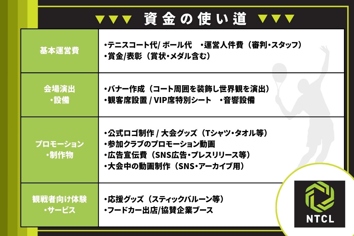 あなたの想いに合わせて、NTCL(Nippon Tennis Club League)を応援できる多彩なリターンをご用意しました。