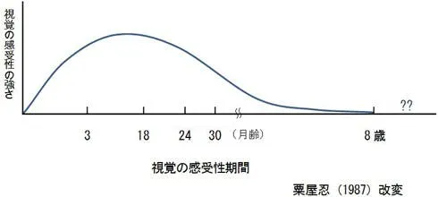 弱視という言葉は、「通常の教育をうけるのが困難なほどの低視力」という意味で一般的に使われていますが、医学的には「視力の発達が障害されておきた低視力」を指し、眼鏡をかけても視力が十分でない場合をさします。しかし早期発見、早期治療で治療可能なことがほとんどです。ここでは後者の弱視(医学的弱視)について説明します。視力は、ことばや歩行などと同じく、成長に伴ってだんだん獲得する能力です。0歳では0.1ぐらいの視力しかなく、3歳ごろに大人と同じ視力に達するとされます。ただし、それを言葉に表現できるのは4歳ごろになります。この視力の成長期に、何らかの邪魔が入って正常な視力の成長が止まってしまい、眼鏡をかけてもよく見えない状態を「弱視」と呼びます。つぎのような4つの原因があります。ただし、弱視は除外診断と呼ばれ、他に目の病気がなにもないと確認することが重要です。そのため、しっかり検査できる年齢になるまで、本当に弱視と判断することは難しく、視力検査だけで弱視と判断するわけではありません。屈折検査や斜視検査などを総合的に判断して、弱視になる可能性が非常に高いと判断すると、予防的に治療を開始します。視力の成長は、他の成長と同じくいつかは止まり、臨界期(感受性期=10歳頃まで)を過ぎると治療に反応しにくくなります。早期に治療を開始するほど、治療に反応して視力が改善していきます。治療の目標は眼鏡をかけて1.0の視力が出ることです。視力は1.0が正常値で、それ以上いくらあっても正常です。ピントがあっている状態で視力が出ることが重要で、眼鏡をかけて1.0あれば正常です。裸眼視力がいくら悪くても、眼にあった眼鏡をかけた状態で1.0の視力が出れば弱視ではありません。