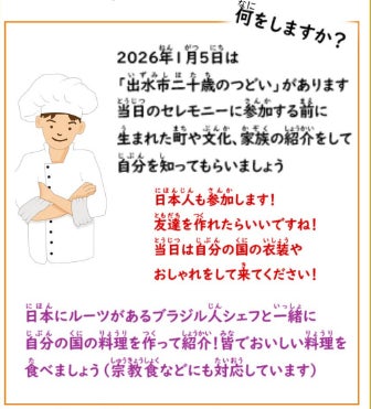本プロジェクトは、今年度二十歳を迎える外国籍の出水市在住の若者たちを対象としています。会場の収容人数の都合上、外国籍の新成人は20名限定で参加いただく予定です。