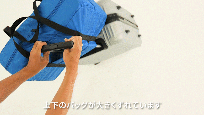 この状態で移動すると、振動などによりキャリーオンバッグの重心がぶれて、ハンドルバーを中心に左右に回ってしまいます。