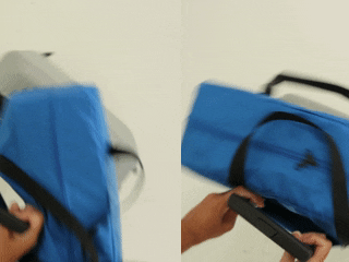この状態で移動すると、振動などによりキャリーオンバッグの重心がぶれて、ハンドルバーを中心に左右に回ってしまいます。
