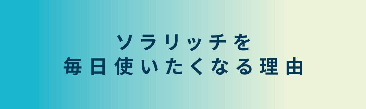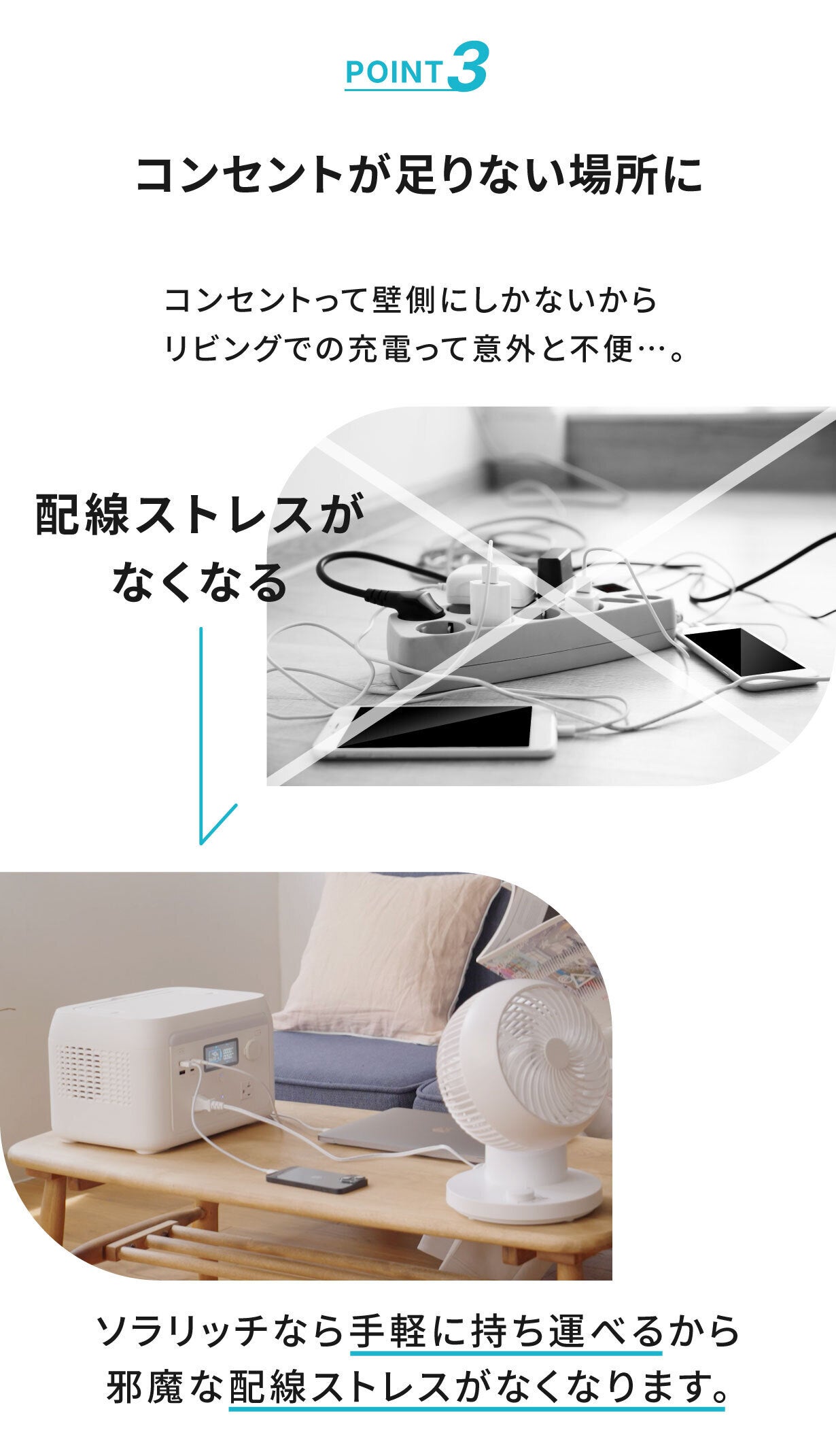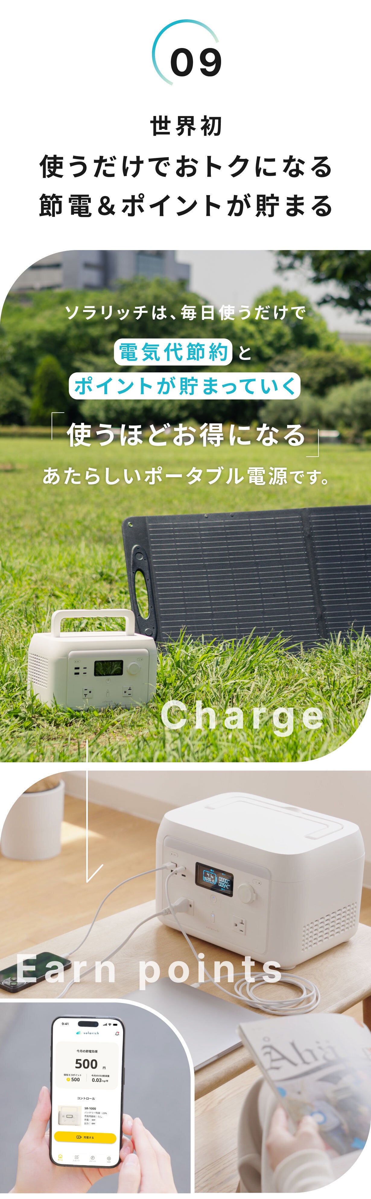 ソラリッチは、毎日使うことがそのまま防災になり、節電になり、ポイントまで貯まっていく、新しいポータブル電源です。 しまい込まず、日常に溶け込むことで、いざという時にもちゃんと役立つ、“使い続けるほど価値が増える電源”です。