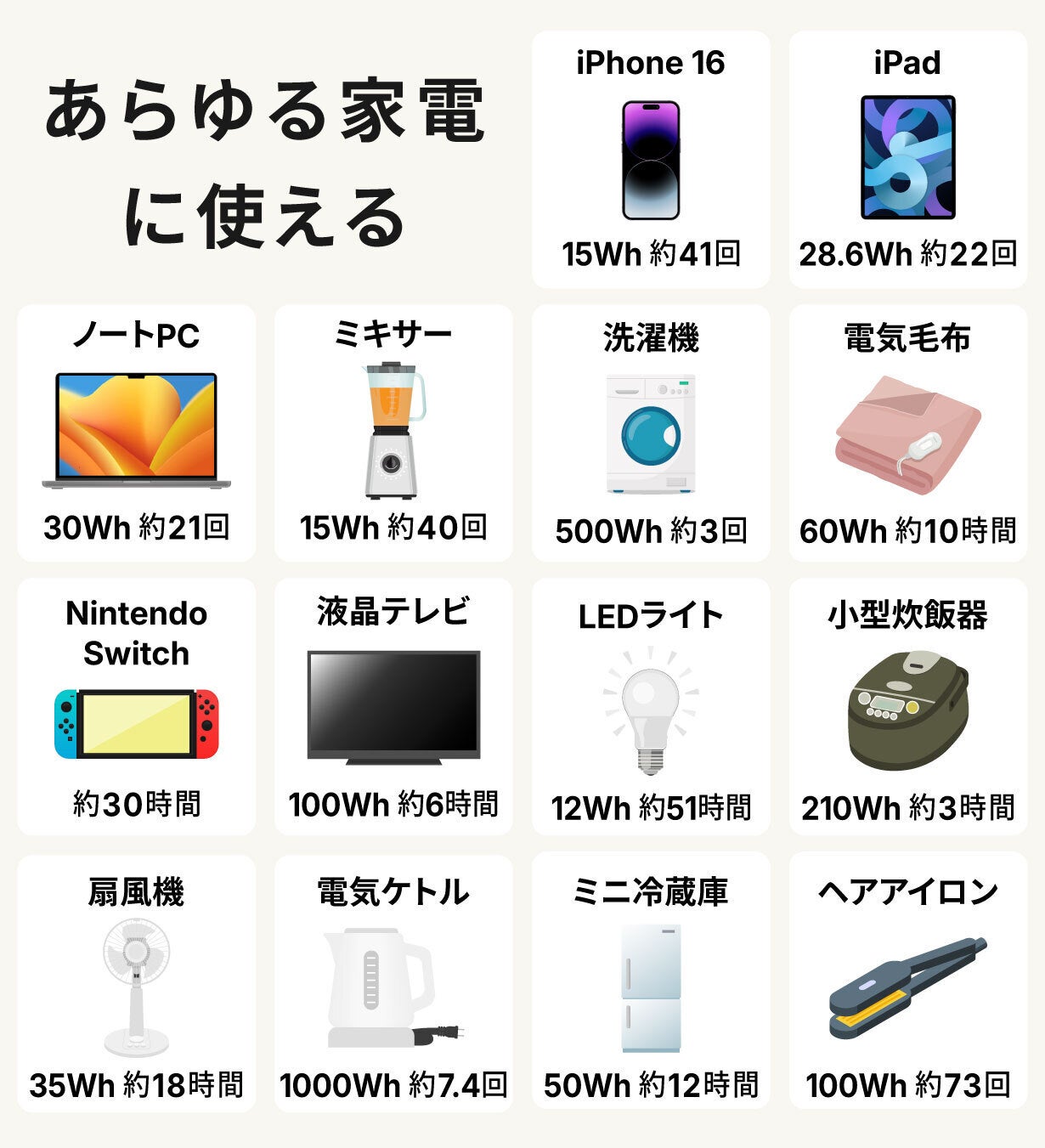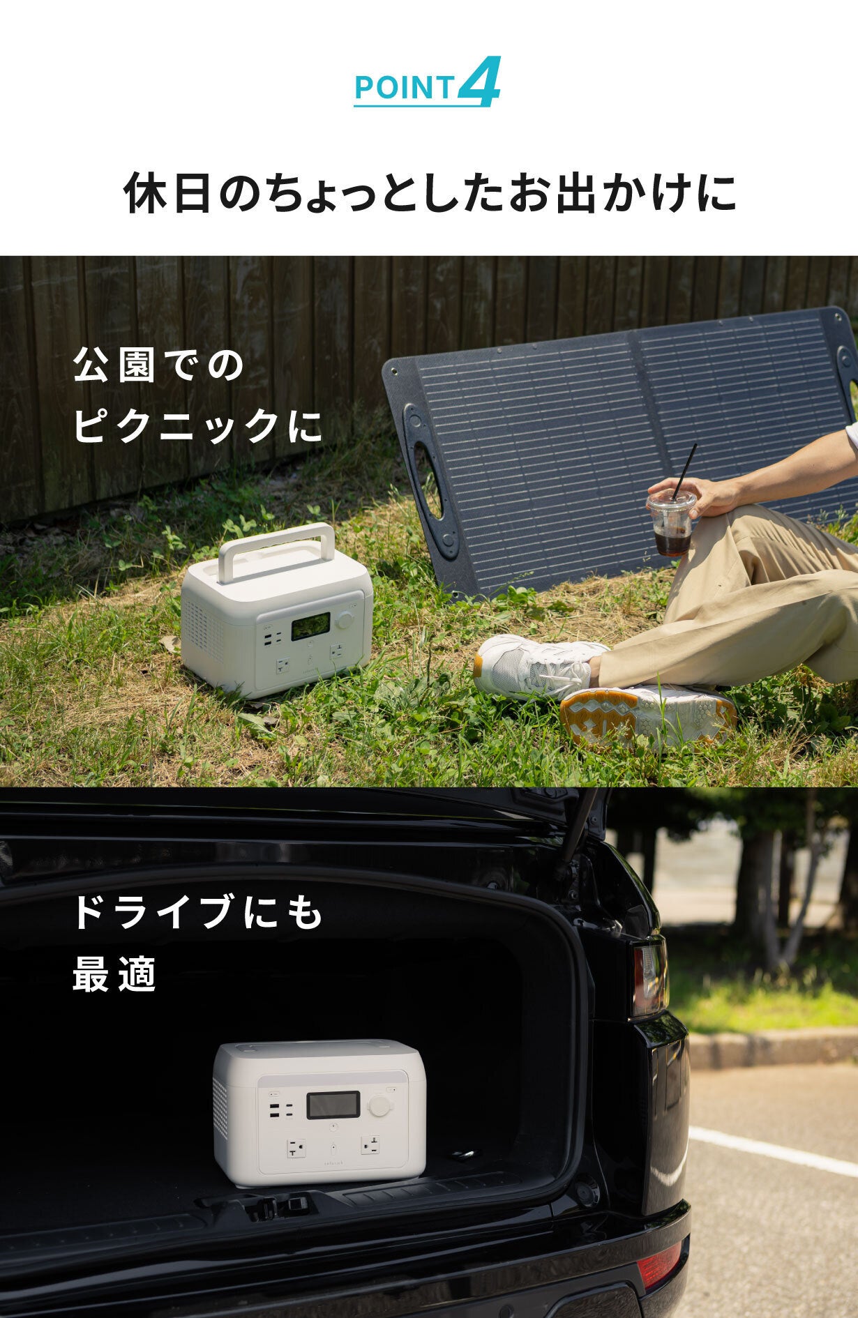 スマホの充電、スピーカーや照明、家電まで使えて、外時間がもっと快適で、自由になります。