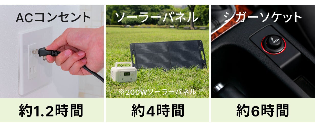 A. ご家庭のコンセントからは約1.2時間で満充電できます。ソーラーパネル(200W)を使う場合は最短約4時間で充電可能です。お車のシガーソケットからも充電でき、約6時間ほどで満充電になります。