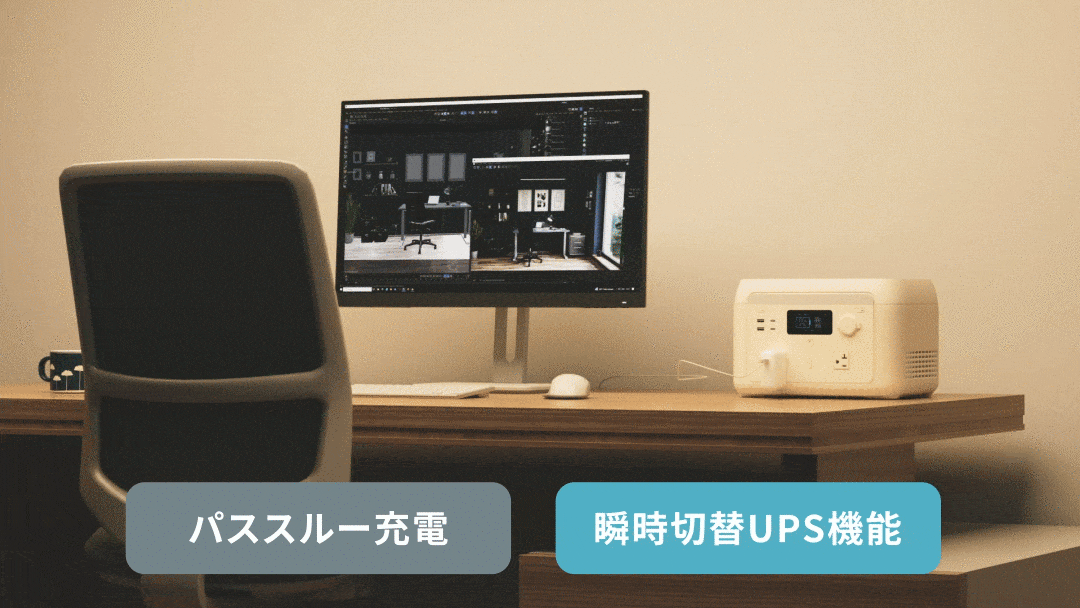 ソラリッチは、充電しながら給電できる「パススルー充電」に対応。デスクトップPCやWi-Fiルーターをつなげたまま、バッテリー本体も同時に充電できます。
