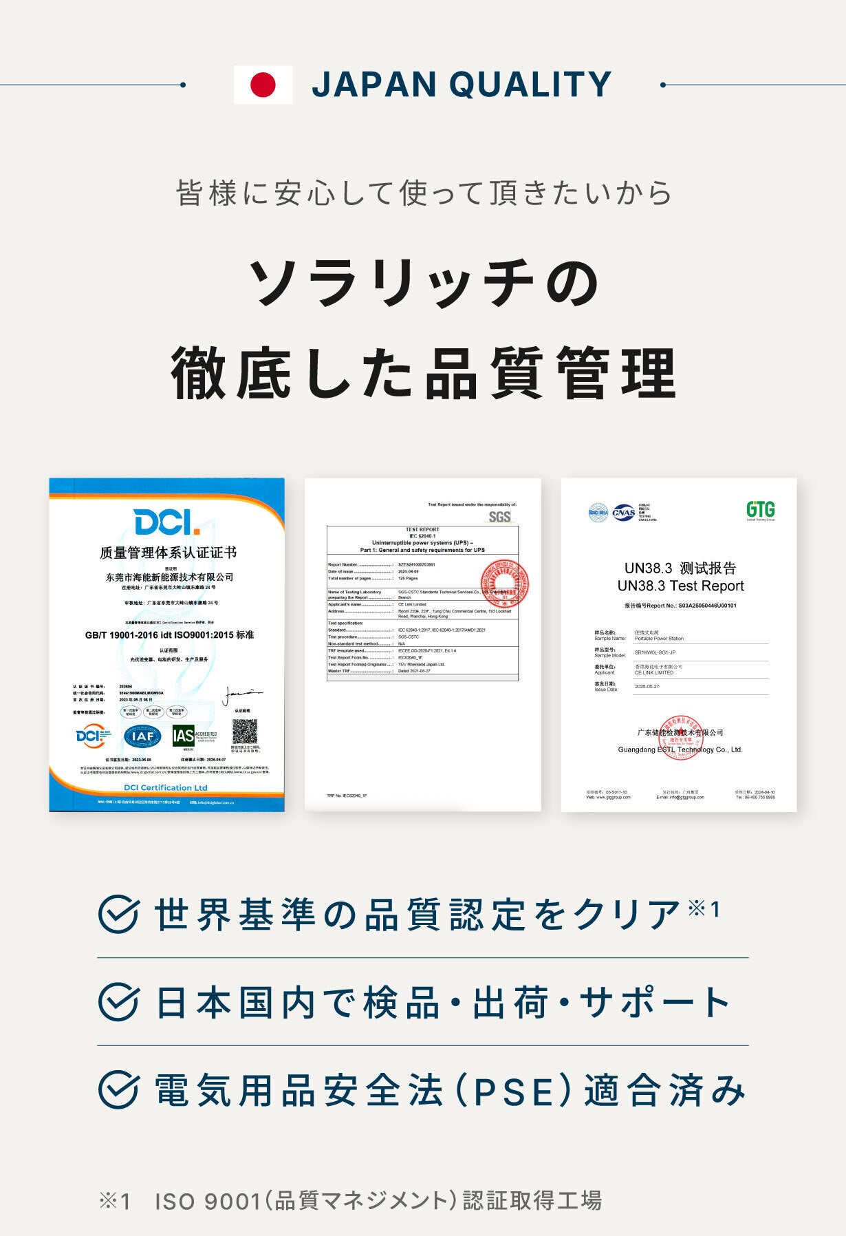 A. 発火リスクが低い「リン酸鉄リチウムバッテリー」を採用し、過充電・過放電・温度上昇などを自動で制御するBMS(バッテリーマネジメントシステム)を搭載しています。PSE認証済みの安全設計です。