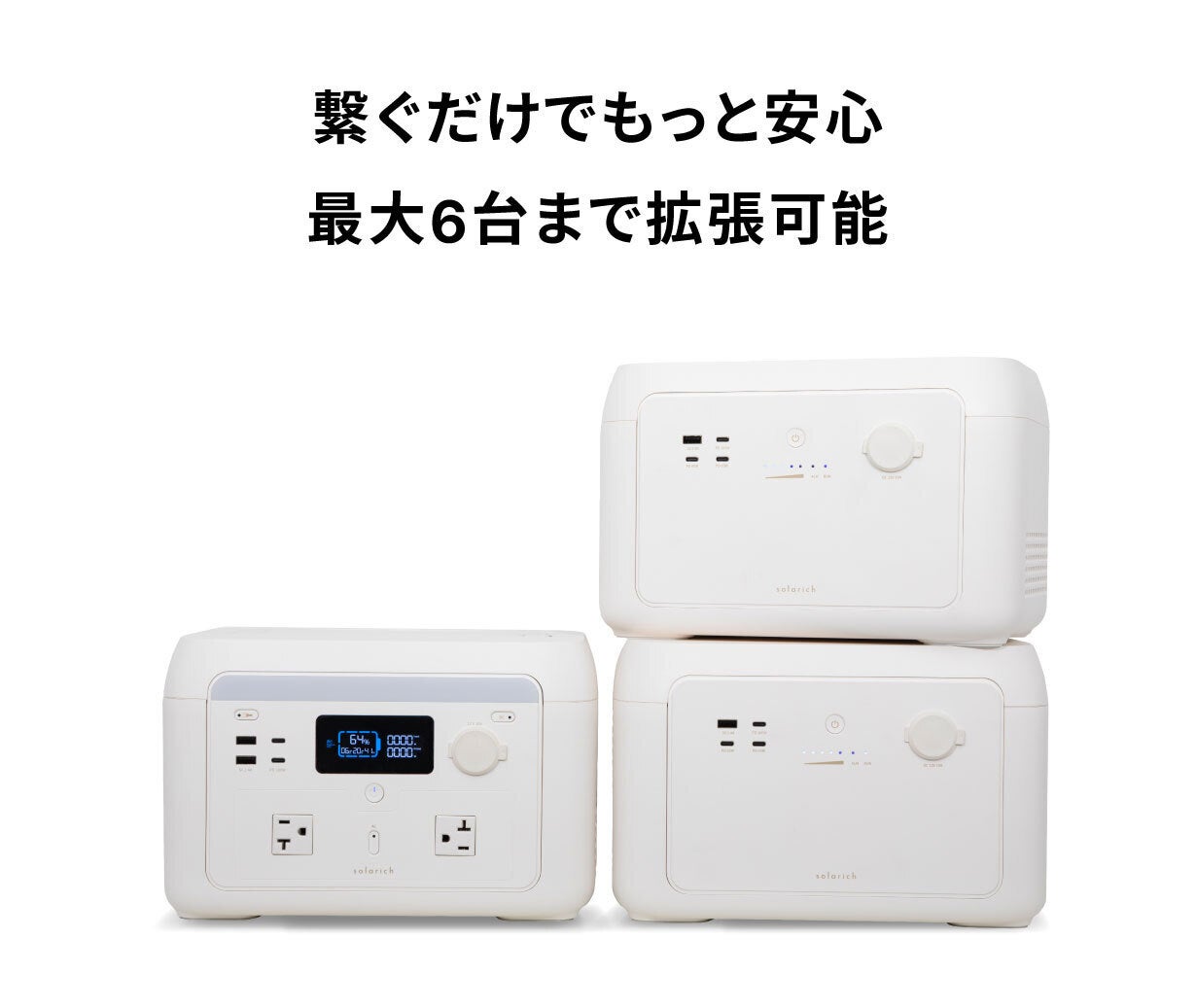 ソラリッチは、専用の拡張バッテリーを繋ぐだけで、最大6台(4298Wh)まで容量アップが可能です。 1日だけの防災から、3日間の避難、1週間以上の長期停電まで必要な安心を必要なだけ増やせる設計です。
