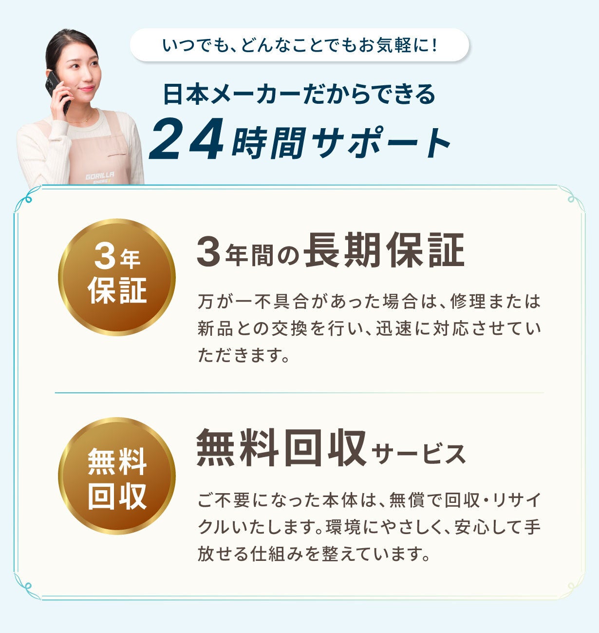・販売店によるサポート:3年間保証(通常利用時に不具合が起こった場合に対応)