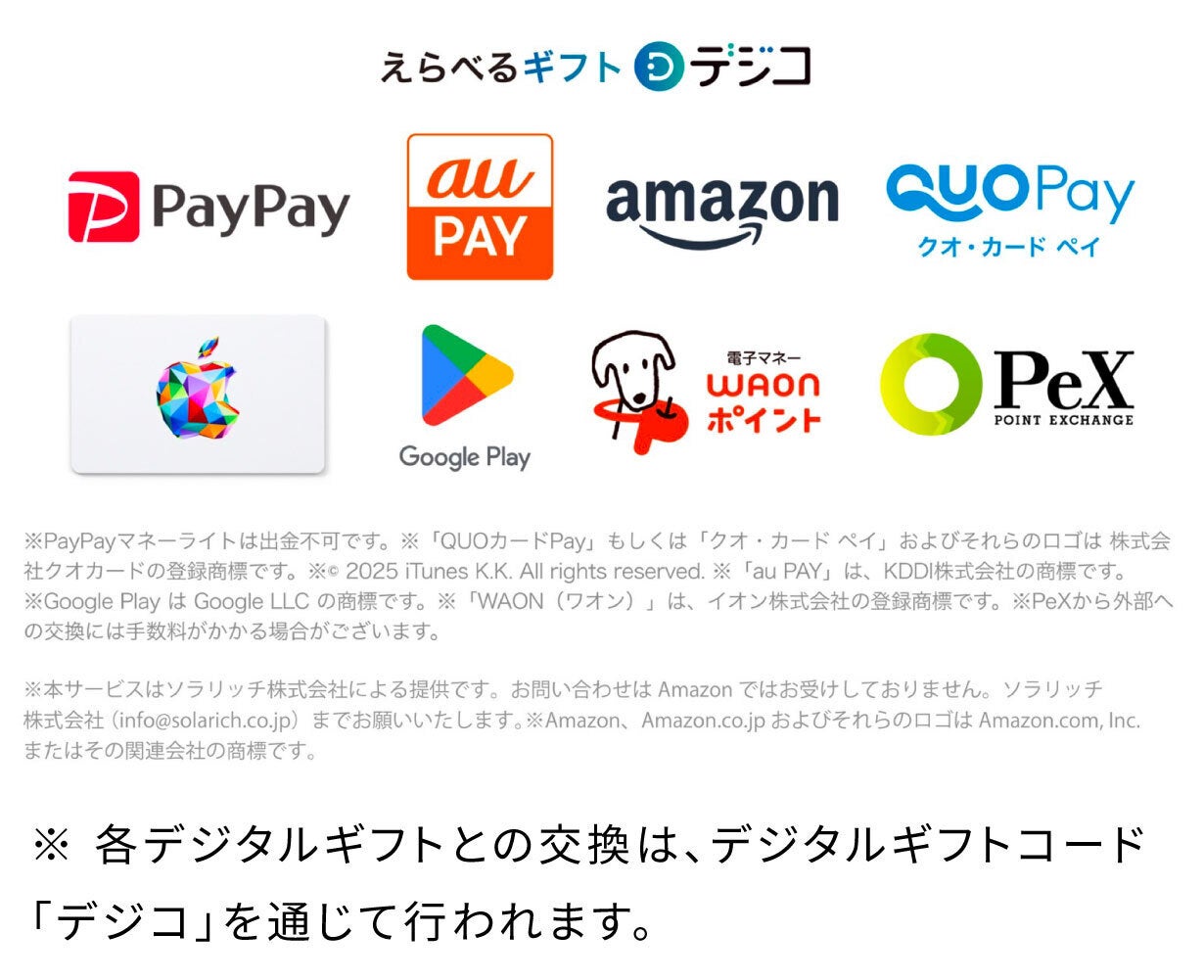 PayPayマネーライト / Amazonギフトカード / Apple Gift Card / Google Play ギフトコード / QUOカードPay / WAONポイントID / nanacoギフト / au PAY ギフトカード / PeXポイントギフト / ドットマネー