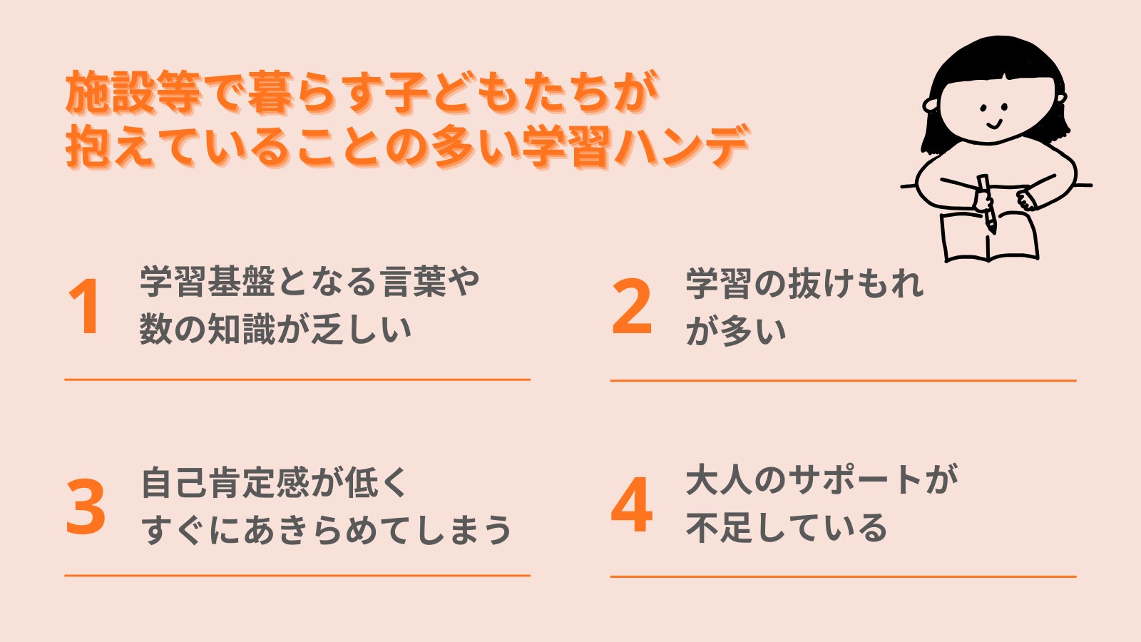塾講師のアルバイトで出会う子どもたちは、幼い頃から習い事や旅行を経験し、当たり前のように基礎学力を身につけていました。一方、施設の子どもたちは高校受験を目前にしても、小学1年生の足し算からやり直さなければならない子もいました。