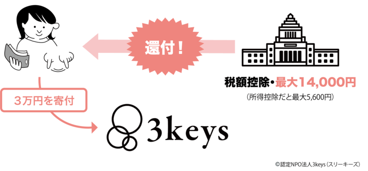 認定NPO法人3keysは、一般的なNPO法人と比べ「より高い公益性をもっている」と所轄庁からお墨つきをもらっている「認定」NPO法人のため、 3keysへの寄付は、納税レベルで社会問題の解決に参加していると国や自治体が認めていることになり、確定申告をすることで寄附額の約40%が所得税より還付されます。