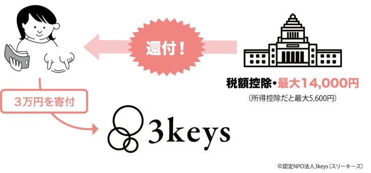 認定NPO法人3keysは、一般的なNPO法人と比べ「より高い公益性をもっている」と所轄庁からお墨つきをもらっている「認定」NPO法人のため、 3keysへの寄付は、納税レベルで社会問題の解決に参加していると国や自治体が認めていることになり、確定申告をすることで寄附額の約40%が所得税より還付されます。