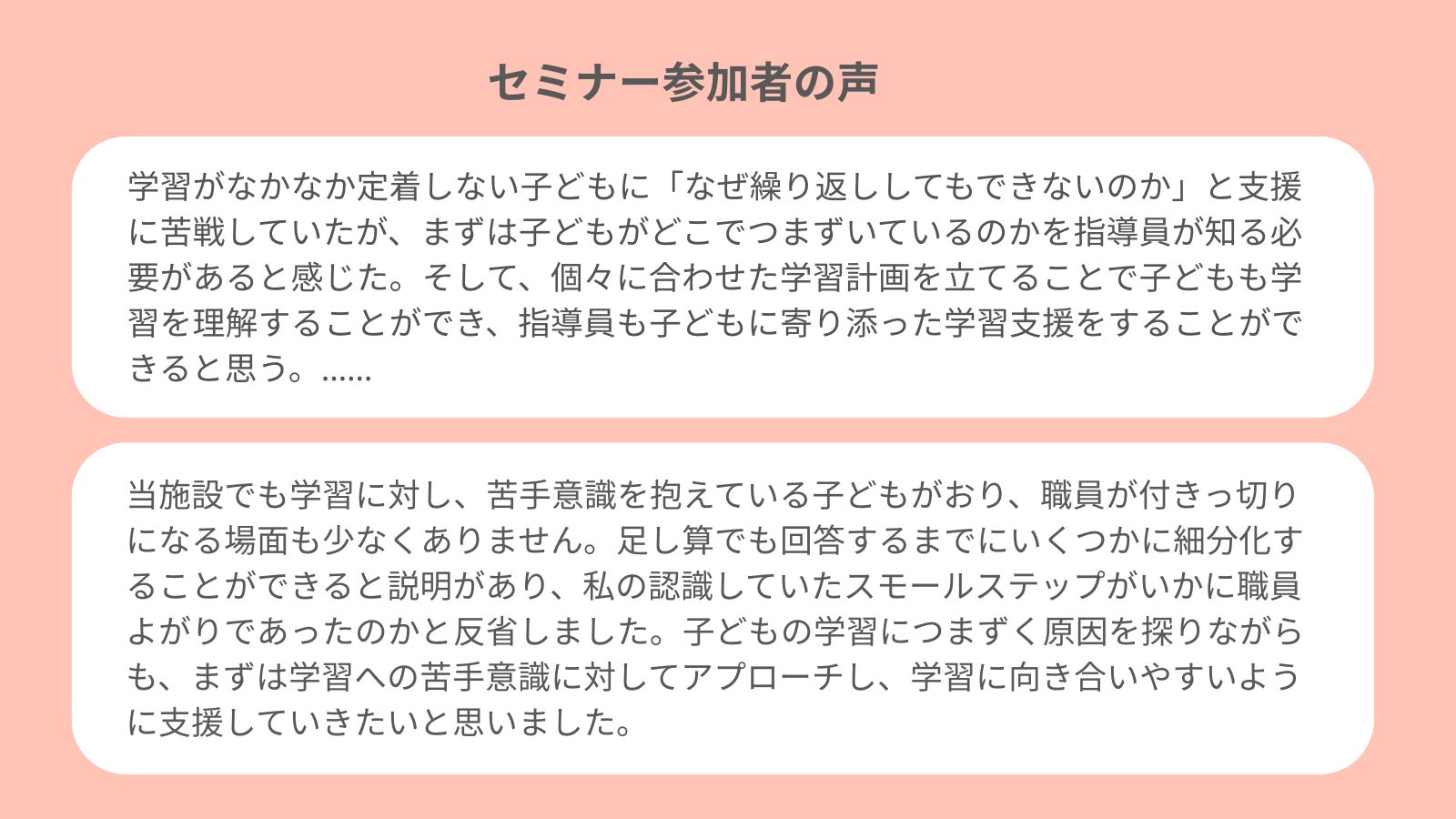 2025年3月と9月には「学習習慣 応援セミナー」を実施し、子どもが学習につまずく理由を10の視点から解説しました。アーカイブ動画と合わせ計160人にご視聴いただき、私たちの活動実績に基づく知見が、多くの方に求められていることを実感しました。