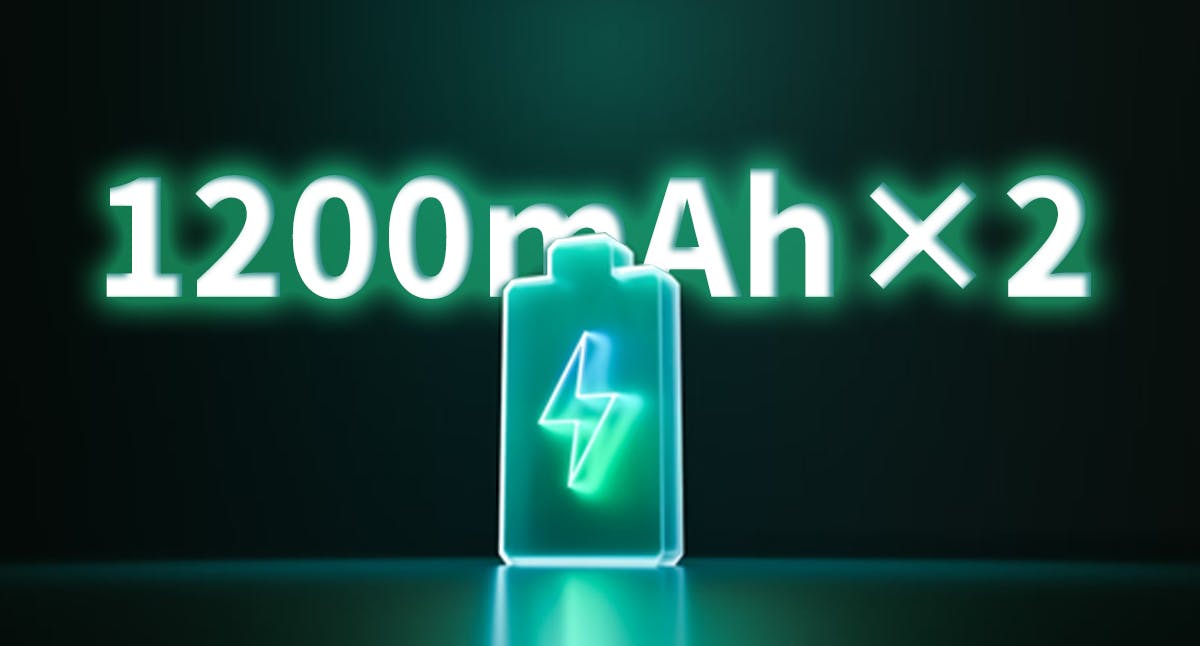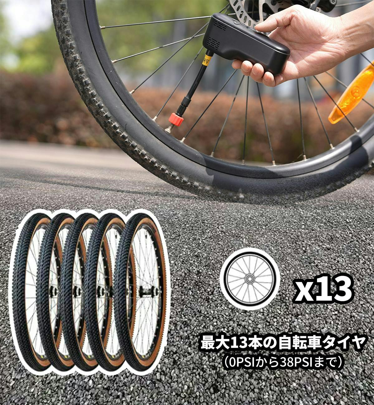 コンパクトサイズに1,200mAh×2超大容量バッテリーを搭載。マウンテンバイクの場合、フル充電では約13本のタイヤに空気を入れることが可能(※0PSIから38PSIまで)!