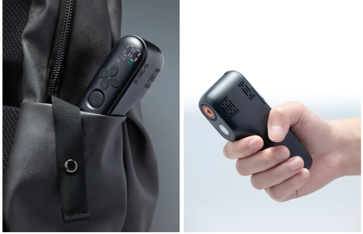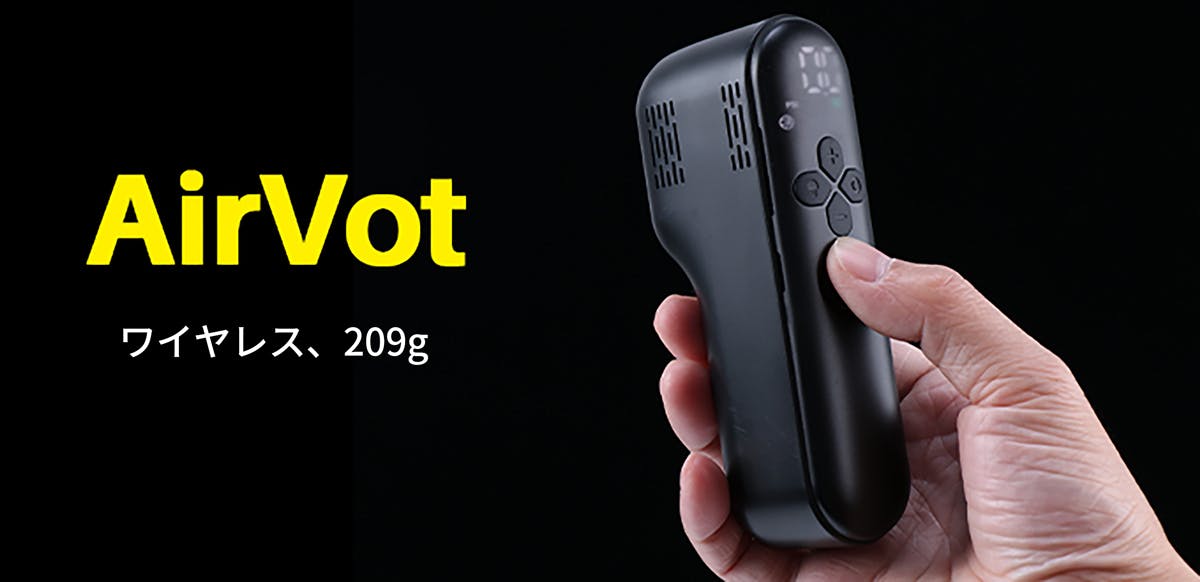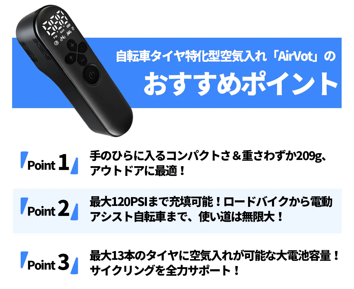 🚵「AirVot」は自転車&バイクのタイヤやボールの空気入れに特化した、指先で簡単に掴める超ミニエアーポンプです。ディスプレイやLEDライト、自動停止など魅力的な機能が満載されており、あなたのサイクリングを全力サポート。