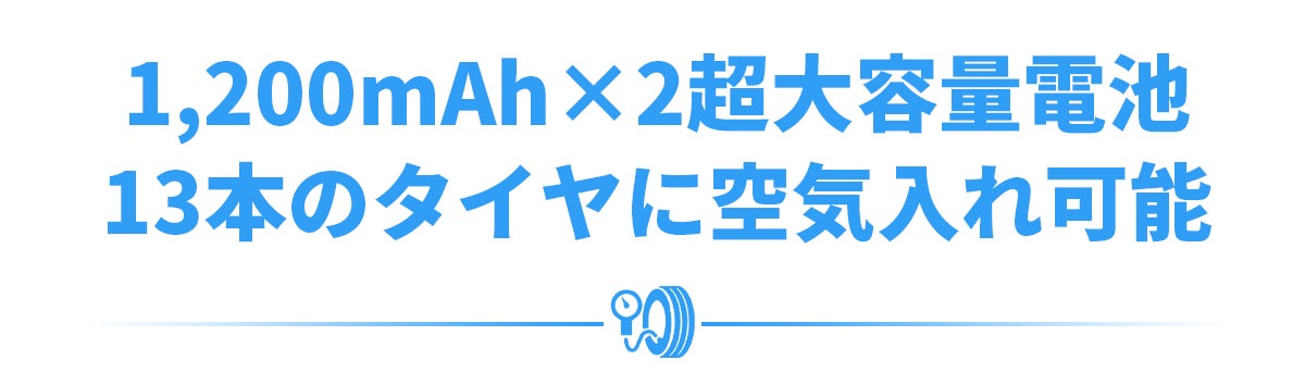 コンパクトサイズに1,200mAh×2超大容量バッテリーを搭載。マウンテンバイクの場合、フル充電では約13本のタイヤに空気を入れることが可能(※0PSIから38PSIまで)!