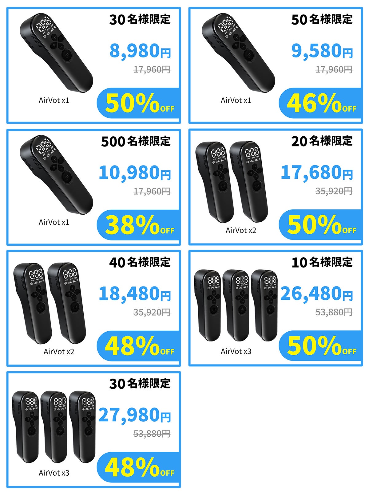 2026/01/05 11:05支援者の皆様お世話になっております。この度は、タイヤ特化型超ミニ空気入れ「AirVot」プロジェクトに、温かいご支援をいただき、誠にありがとうございました。皆様のおかげをもちまして、プロジェクトを無事に終了することができました。開発者、スタッフ一同、心より御礼申し上げます。【重要】リターン発送スケジュールについて皆様からお預かりした貴重なご支援金を確かな製品にお届けするため、現在、製造の最終準備を進めております。現時点での予定スケジュールは下記の通りです。・生産開始 2026年1月・生産終了 2026年2月・運送開始 2026年3月・運送終了 2026年3月※遅くも3月31日にお届け完了予定※生産状況によっては予定のスケジュールより早く出荷する場合がございます。引き続き、何卒よろしくお願い申し上げます。シンズ・ストア チーム一同 もっと見る【あと2日!】プロジェクト終了間近!最大50%OFF!