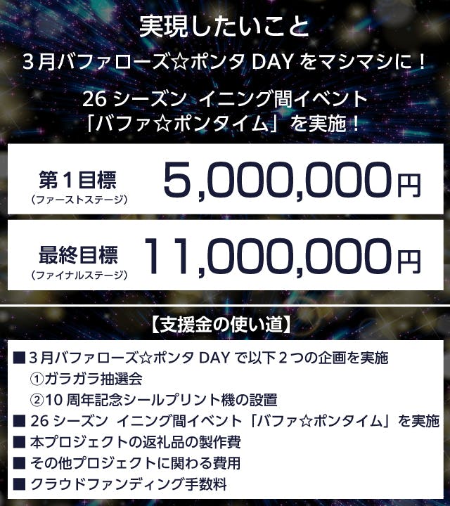 2025/12/01 20:00いよいよ本日より、「バファローズ☆ポンタ優勝祈願プロジェクト」がスタートしました。さっそくご支援いただいた皆さま、本当にありがとうございます。今回のプロジェクトの目標は、イニング間イベント「バファ☆ポンタイム」の復活です。昨シーズン、私たちはバファローズ☆ポンタDAYを4回実施しましたが、京セラドーム大阪で多くのファンの皆さまから「バファ☆ポンを掲げるイベントがなくなってさみしい」という声を数多くいただきました。さらに、SNSのコメントでも同様のお声をたくさん頂戴し、このイベントが本当に愛されていた時間だったことをあらためて実感しました。2026シーズンは、ファンの皆さまと一体となってバファローズを応援するこのイベントを、より大切に実施していきたいと考えています。差し支えなければ、みなさまの温かいご支援を賜れますと大変うれしく思います。どうぞよろしくお願いいたします。 もっと見る