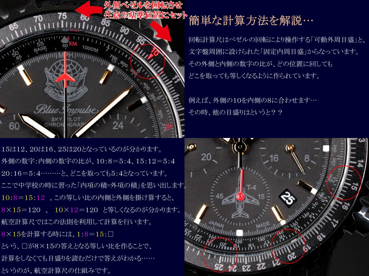 外側のベゼルが回転し、内側のインナーベゼルの目盛との組み合わせによって掛算・割り算が容易に計算でき、時間、速度、距離、燃料消費率、高度上昇率計算などが計測できる。緻密で正確に刻まれた数字や記号は芸術的な美しさで、見た目にも華やかさがあり腕元をクールに彩ってくれます。応用すれば掛け算・割り算が関係する計算は、基本的にどの計算でも可能となっており、為替の換算や割り勘の計算など、実生活での様々なシーンで利用することが可能となっています。