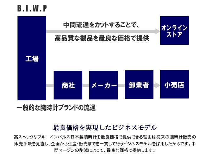 今回のプロジェクトではブルーインパルスの高品質な日本製腕時計を従来の価格より安価でのご提供を実現!この価格で提供できる理由は従来の腕時計販売の販売手法を見直し、企画から生産・販売までを一貫して行うビジネスモデルを採用したからです。中間マージンの削減によって、最良な価格で提供します。