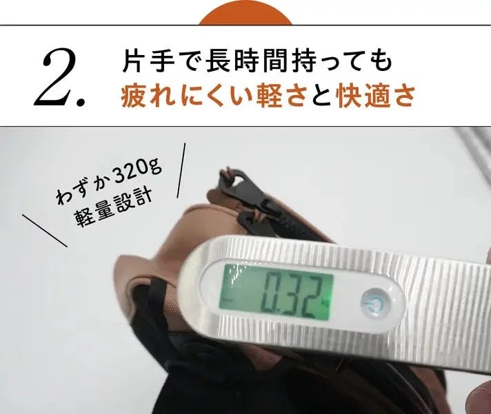 わずか320gの軽量設計で、バッグの重さを感じさせません。軽やかな使い心地で、長時間持っていても肩や腕に負担をかけず、快適に過ごせます。毎日の移動やお出かけも、疲れを気にせず楽しめる軽さを実現しました。