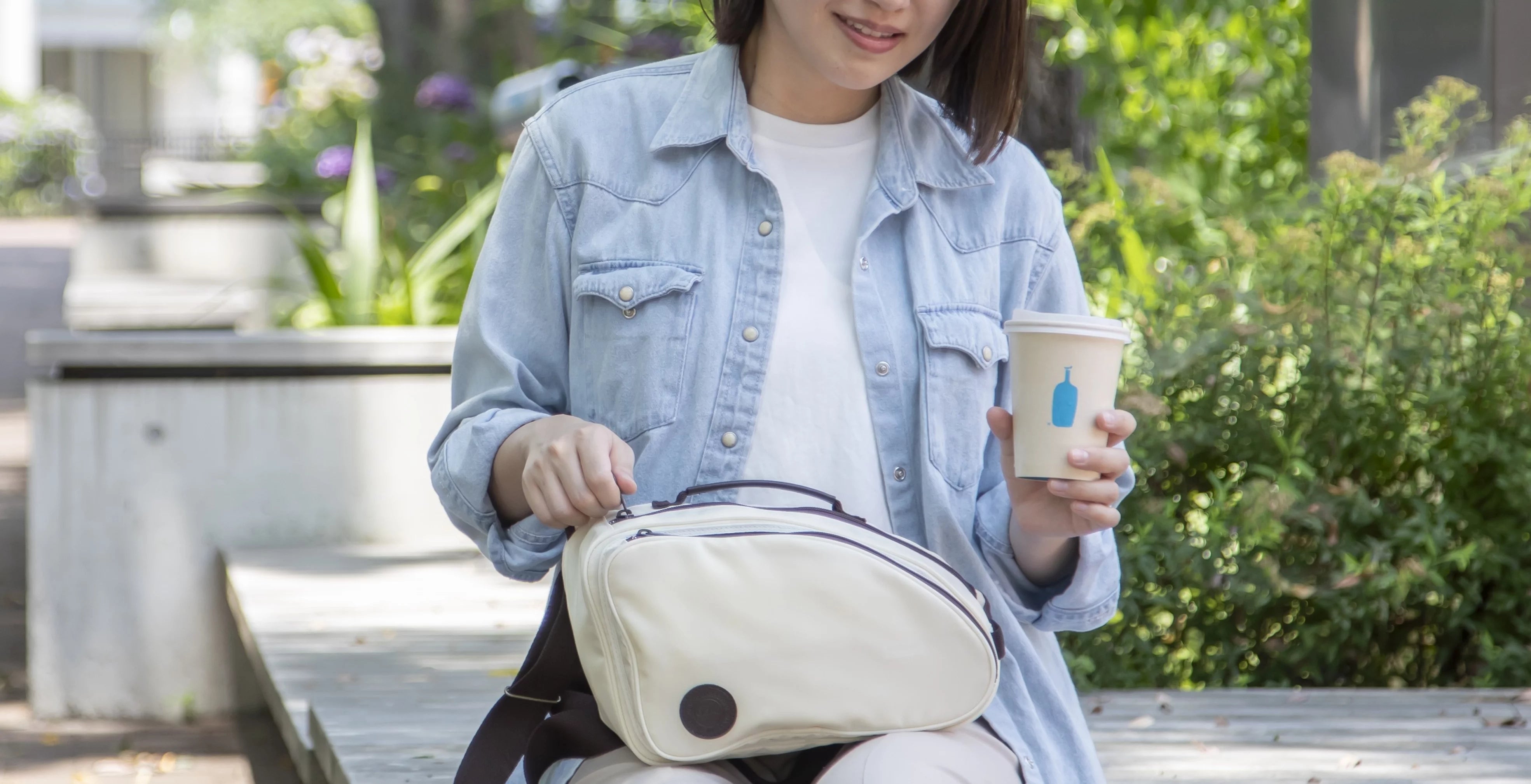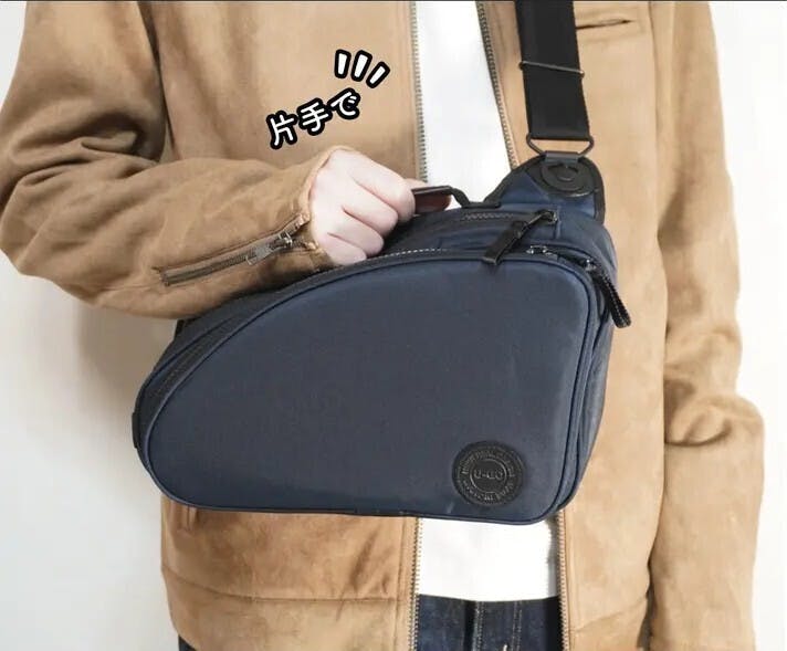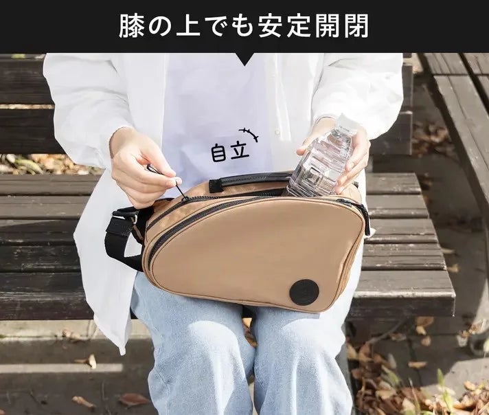 自立することにより、座った状態でも膝の上で安定してモノの出し入れをすることが出来ます。持ち手があることにより、片手で簡単に持ち運べ、引き寄せるなどバッグの取り回しを快適に行えます。