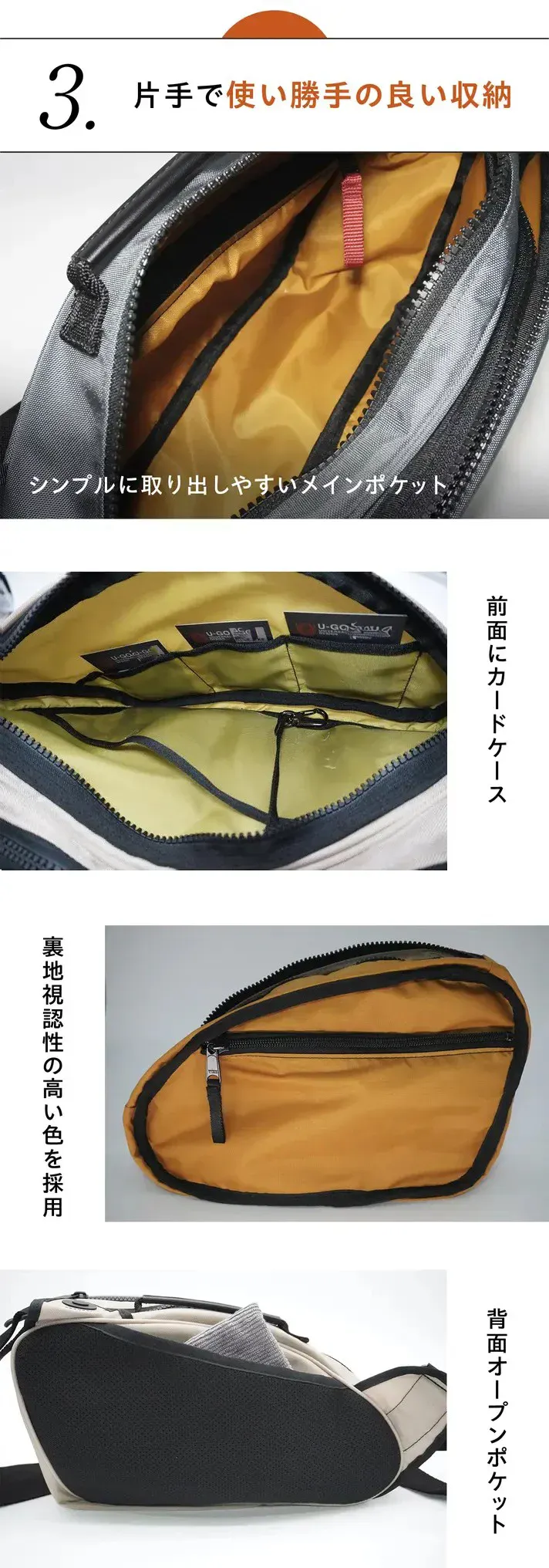 片手での出し入れの際、ポケットに引っ掛かり出し入れしにくいとご意見いただけたので、片手での出し入れにこだわった、ポケットをなくし、ファスナーポケット1か所にし引っ掛りをなくし、シンプル収納に改良しました。