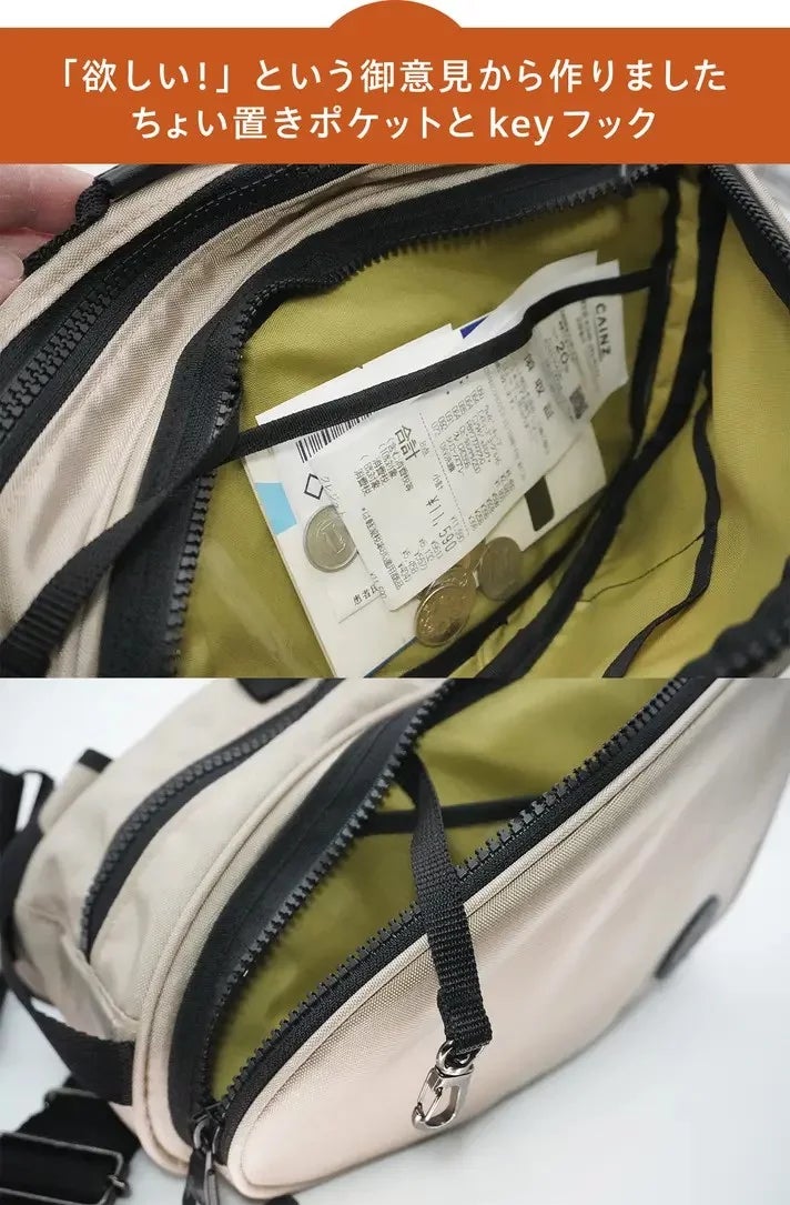 レシートや、お釣り、メンバーカードなど、受け渡しの際、ちょっと置けるポケットが欲しいという御意見から、前面収納に片手でさっと投げこめ、 一目でわかる透明ポケットのちょい置きポケットを新たに作りました。また、Kyeフックを付けてほしいという御意見もありましたので、新バージョンにkyeフックを取り付けました