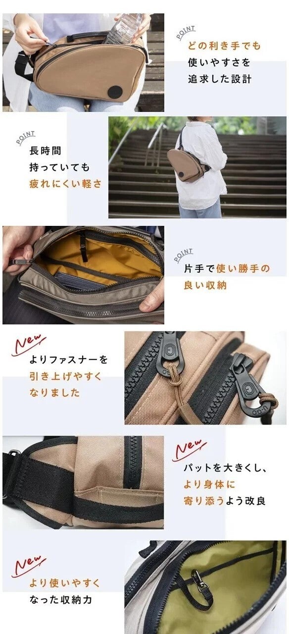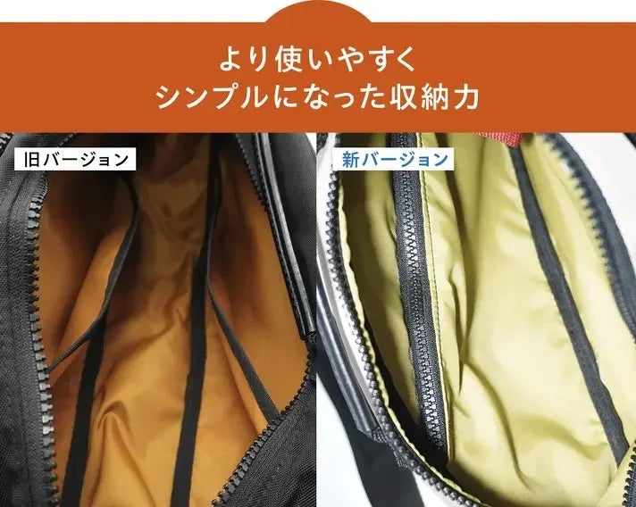 片手での出し入れの際、ポケットに引っ掛かり出し入れしにくいとご意見いただけたので、片手での出し入れにこだわった、ポケットをなくし、ファスナーポケット1か所にし引っ掛りをなくし、シンプル収納に改良しました。